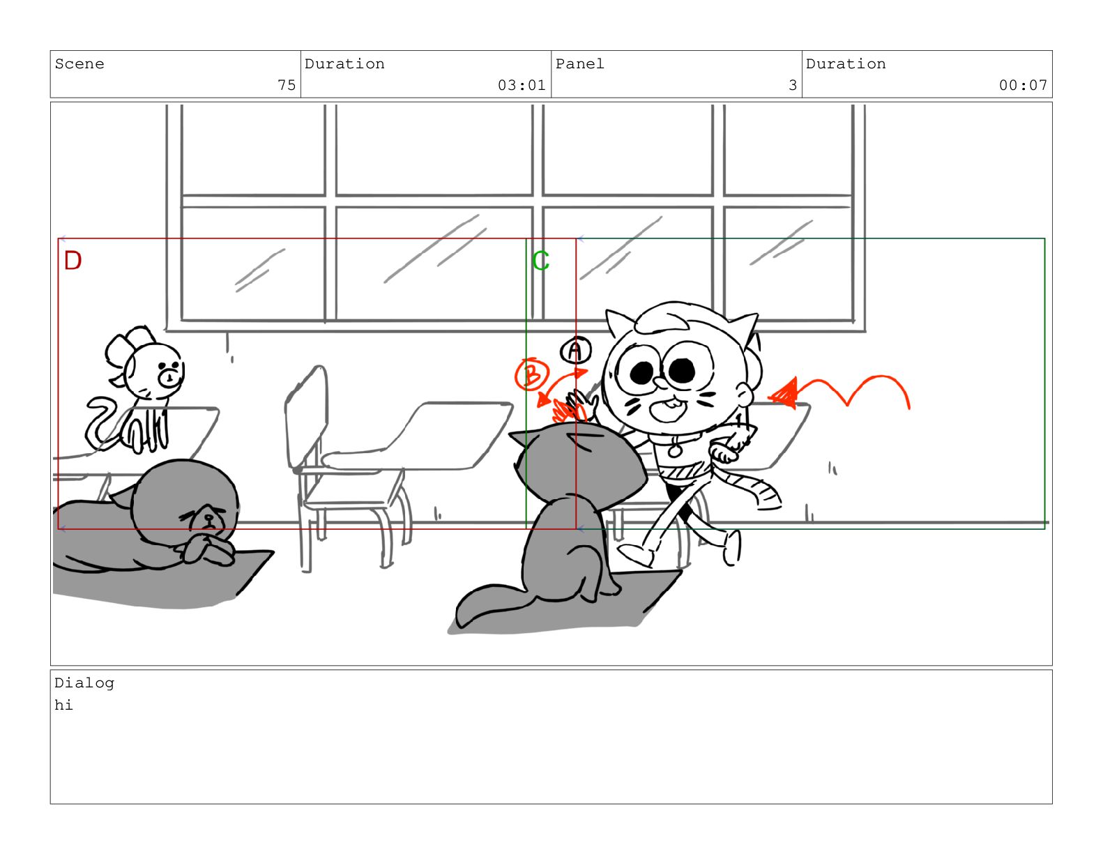 Scene 75 Duration 03:01 Panel 3 Duration 00:07 Dialog hi