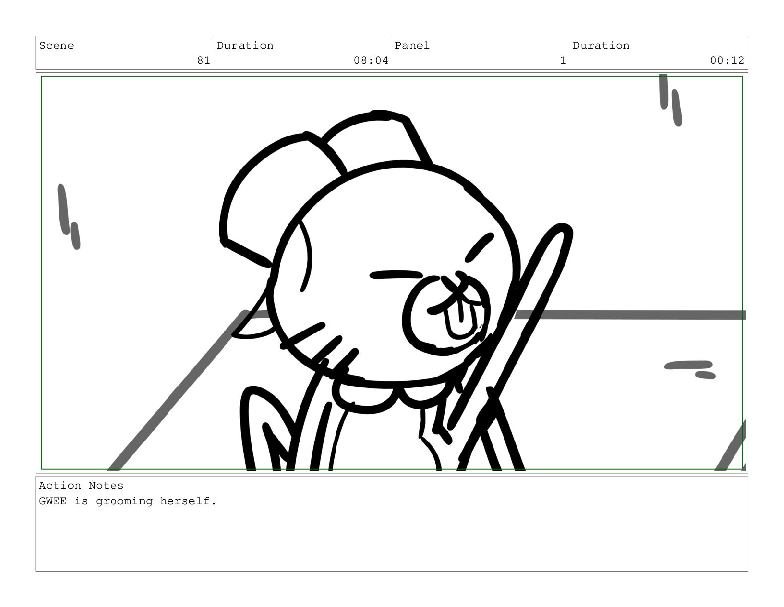 Scene 81 Duration 08:04 Panel 1 Duration 00:12 Action Notes