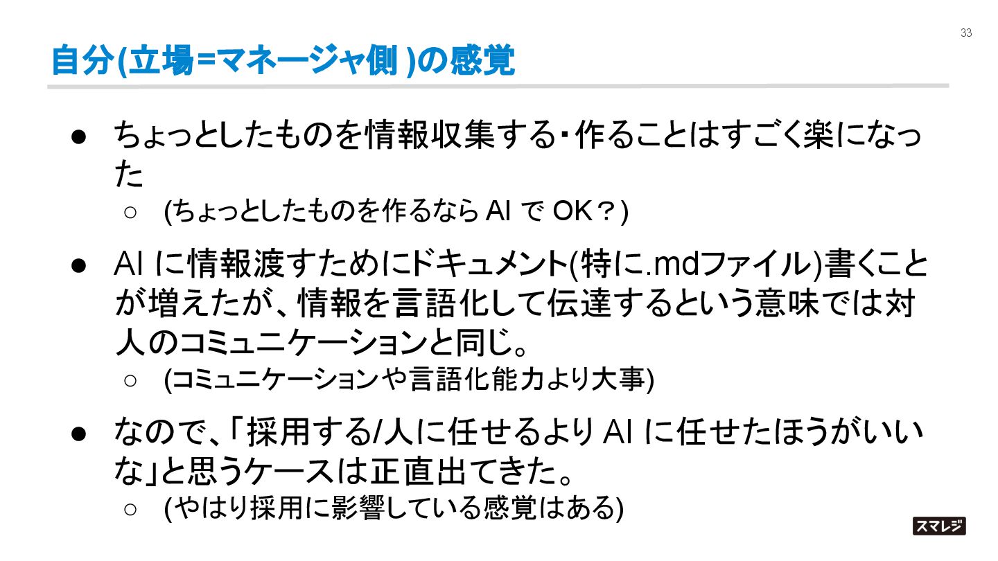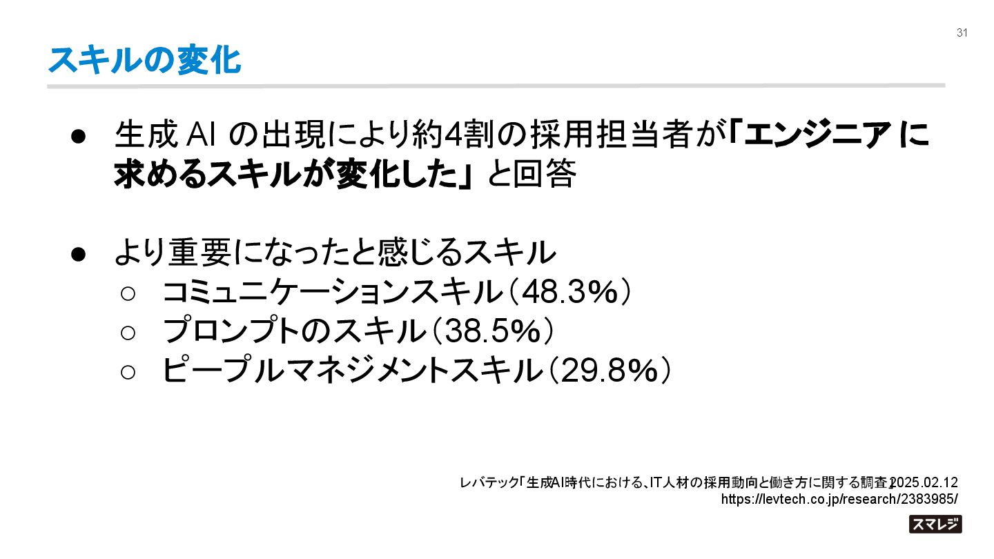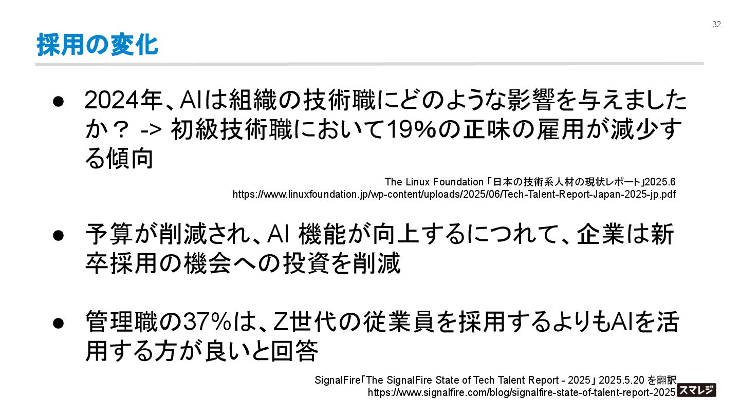 機能が向上するにつれて、企業は新 卒採用の機会への投資を削減 • 管理職の37%は、Z世代の従業員を採用するよりもAIを活 用する方が良いと回答 The Linux Foundation 「日本の技術系人材の現状レポート」 2025.6 https://www.linuxfoundation.jp/wp-content/uploads/2025/06/Tech-Talent-Report-Japan-2025-jp.pdf SignalFire「The SignalFire State of Tech Talent Report - 2025」 2025.5.20 を翻訳 https://www.signalfire.com/blog/signalfire-state-of-talent-report-2025