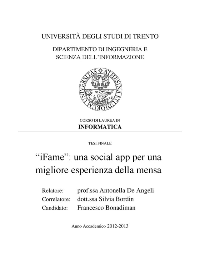 TrentoRISE. http://www.trentorise.eu/. [3] Balsamiq Mockups. http://www.balsamiq.com/products/mockups. [4] Pixton. http://www.pixton.com. [5] Go!Animate. http://goanimate.com/. [6] H. Sharp, Y. Rogers, J. Preece, “Interaction Design: Beyond Human-Computer Interaction”, 2^ edizione, John Wiley & Sons, 2007. [7] T. Schlatter, D. Levinson, “Visual Usability: Principles and Practices for Designing Digital Applications”, 1^ edizione, Morgan Kaufmann, 2013. [8] K. Mullet, D. Sano, “Designing Visual Interfaces: Communication Oriented Techniques”, 1^ edizione, Prentice Hall, 1994. [9] SIGCHI. http://www.sigchi.org/. [10] ACM. http://www.acm.org/. [11] A. Grimes, R. Harper, “Celebratory Technology: New Directions for Food Research in HCI”, in Proceedings of the SIGCHI Conference on Human Factors in Computing Systems, CHI ‘08, pagg. 467-476, New York, NY, USA, 2008. ACM. [12] J. Xu, P. Chen, S. Uglow, A. Scott, E. Montague, “Design Challenges and Guidelines for Persuasive Technologies that Facilitate Healthy Lifestyles”, in International Journal of Computer Technology and Application 3, pagg. 140-147, 2012. [13] C. Linehan, T. Leeman, C. Borrowdale, S. Lawson, “Crowd saucing: social technology for encouraging healthier eating”, in Interactions (volume 20, issue 1, January + February 2013), pagg. 53-57, New York, NY, USA, 2013. ACM.