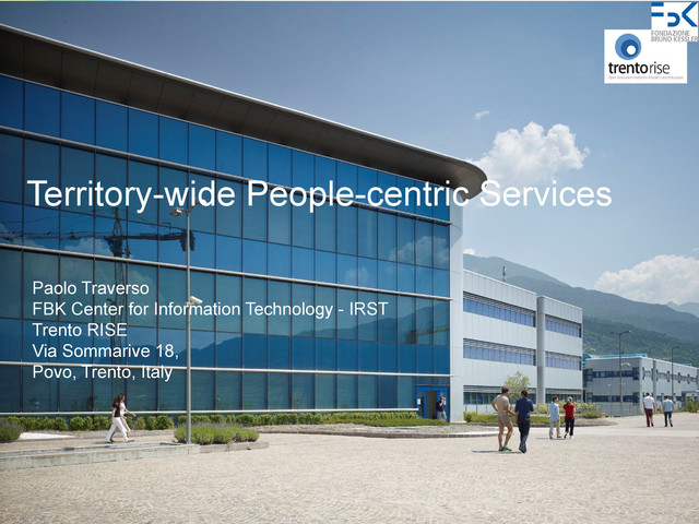 Integrates the different mobility services offered by the territory Bus, train, car/bike sharing, car pooling, parking, road condition, … Suggests personalized and contextual solutions based on user profile, user preferences and current mobility context User: Disability, preferred transport means, type of journey (family, work,..) Context: Train/bus delays, parking availability, strikes, .. Supports the user not only in the planning of the journey but throughout the journey execution Parking payment, train booking, notification of problems (delays, jams..), proposal of alternative routes/solutions, ..