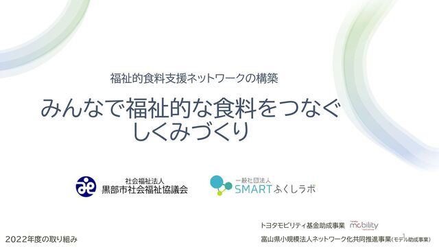 みんなで福祉的な食料をつなぐ しくみづくり 福祉的食料支援ネットワークの構築 トヨタモビリティ基金助成事業 2022年度の取り組み 富山県小規模法人ネットワーク化共同推進事業(モデル助成事業) 1