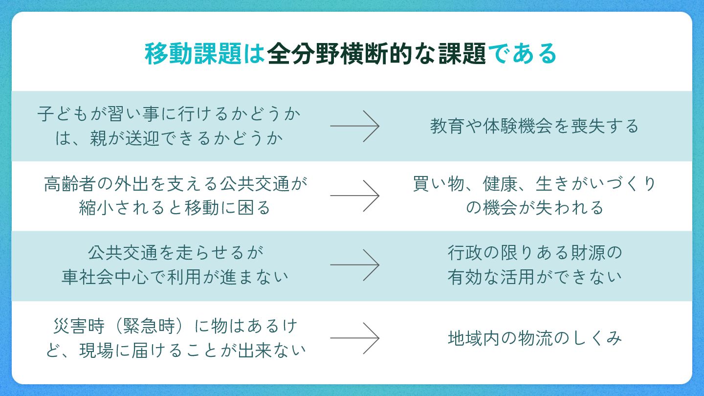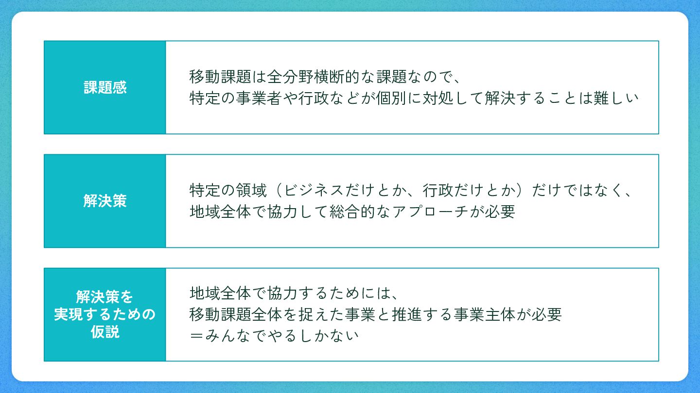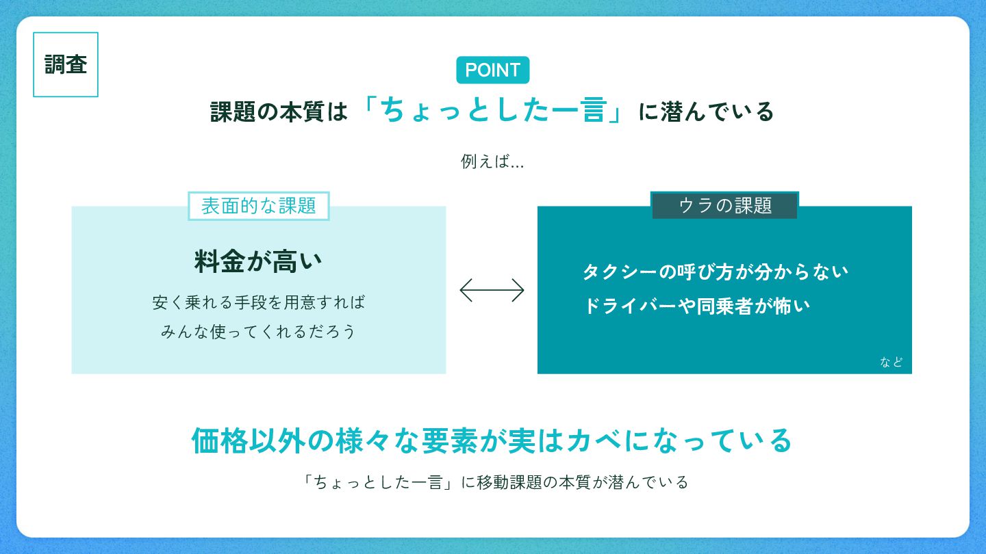 課題の本質は「ちょっとした一言」に潜んでいる 例えば… 「ちょっとした一言」に移動課題の本質が潜んでいる 表面的な課題 ウラの課題 安く乗れる手段を用意すれば みんな使ってくれるだろう 料金が高い タクシーの呼び方が分からない ドライバーや同乗者が怖い