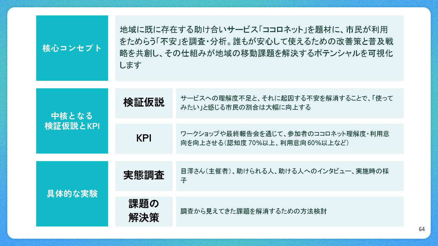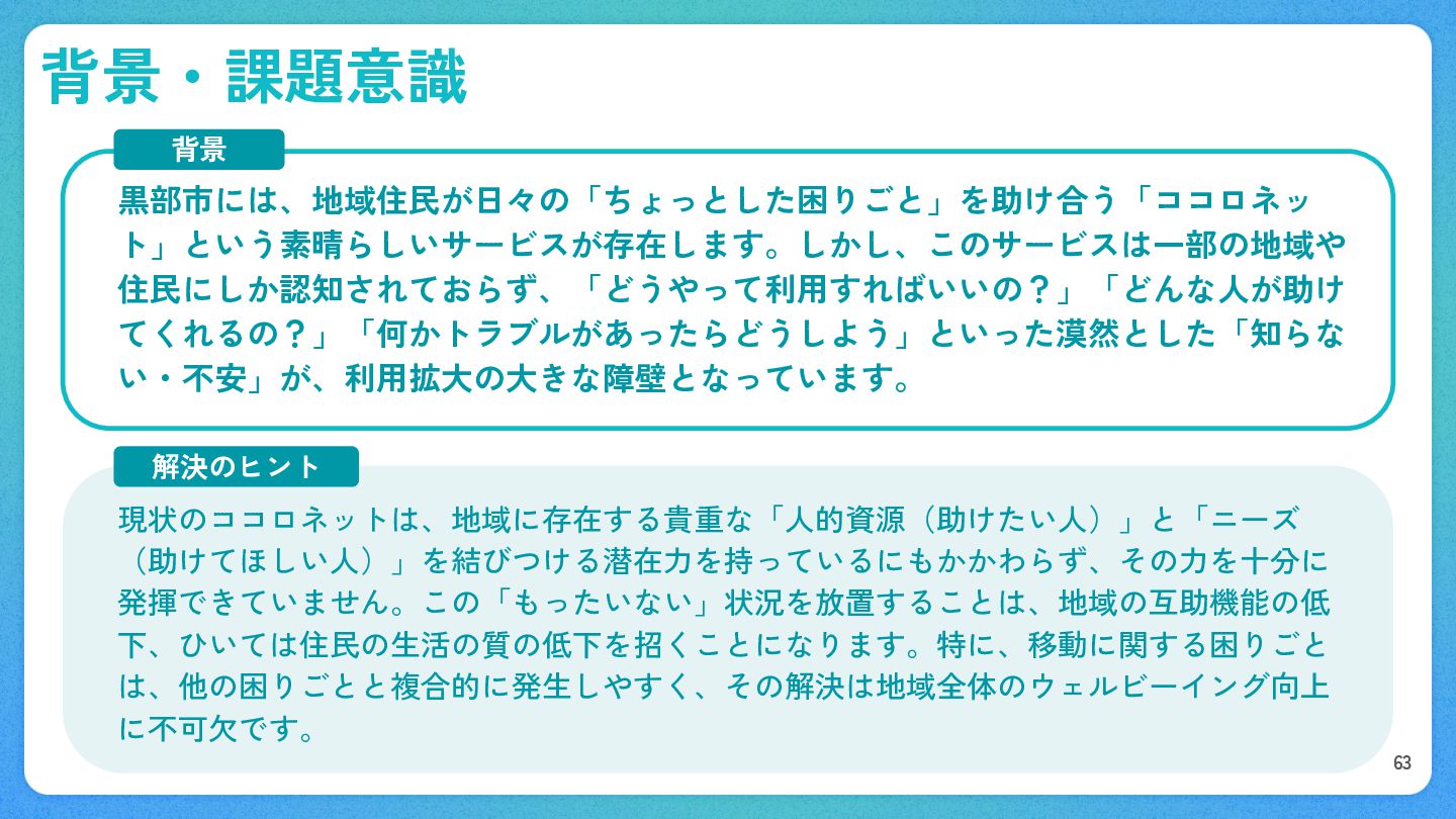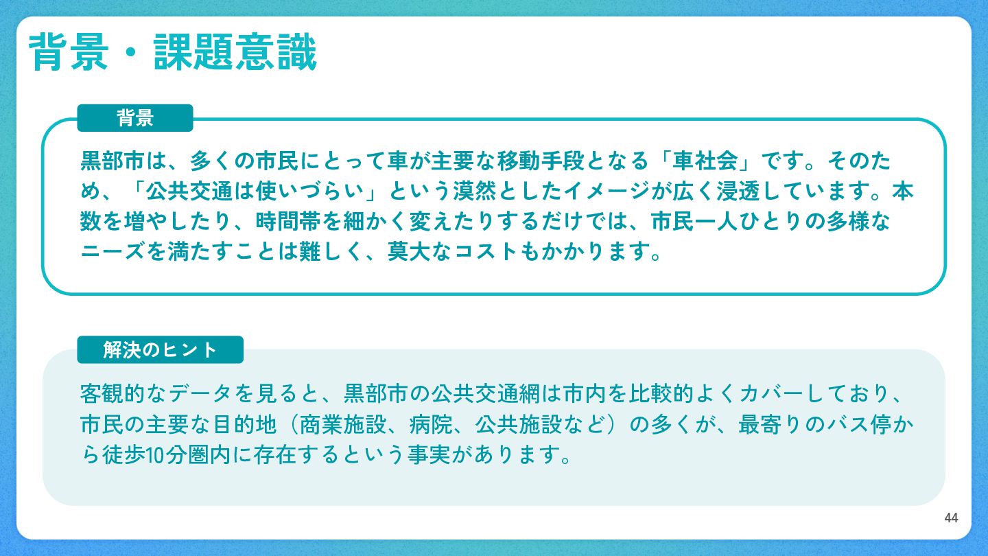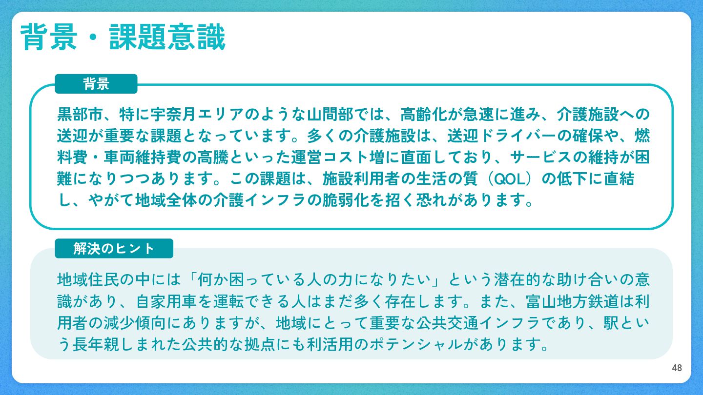 課題の本質は「ちょっとした一言」に潜んでいる 例えば… 「ちょっとした一言」に移動課題の本質が潜んでいる 表面的な課題 ウラの課題 安く乗れる手段を用意すれば みんな使ってくれるだろう 料金が高い タクシーの呼び方が分からない ドライバーや同乗者が怖い