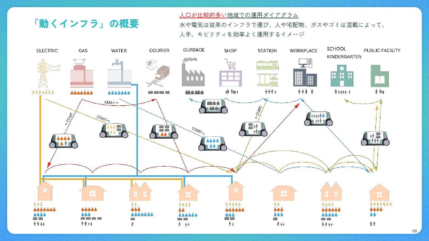 101 人口が比較的多い地域での運用ダイアグラム 水や電気は従来のインフラで運び、人や宅配物、ガスやゴミは混載によって、 人手、モビリティを効率よく運用するイメージ 「動くインフラ」の概要