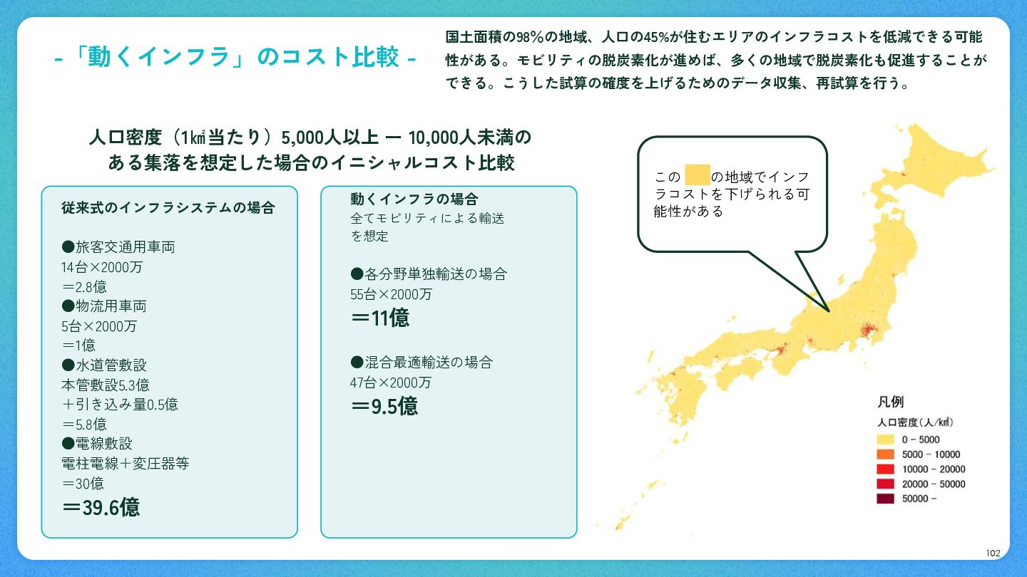 +引き込み量0.5億 =5.8億 •電線敷設 電柱電線+変圧器等 =30億 =39.6億 動くインフラの場合 全てモビリティによる輸送 を想定 •各分野単独輸送の場合 55台×2000万 =11億 •混合最適輸送の場合 47台×2000万 =9.5億 人口密度(1㎢当たり)5,000人以上 ー 10,000人未満の ある集落を想定した場合のイニシャルコスト比較 この の地域でインフ ラコストを下げられる可 能性がある 国土面積の98%の地域、人口の45%が住むエリアのインフラコストを低減できる可能 性がある。モビリティの脱炭素化が進めば、多くの地域で脱炭素化も促進することが できる。こうした試算の確度を上げるためのデータ収集、再試算を行う。 -「動くインフラ」のコスト比較 -