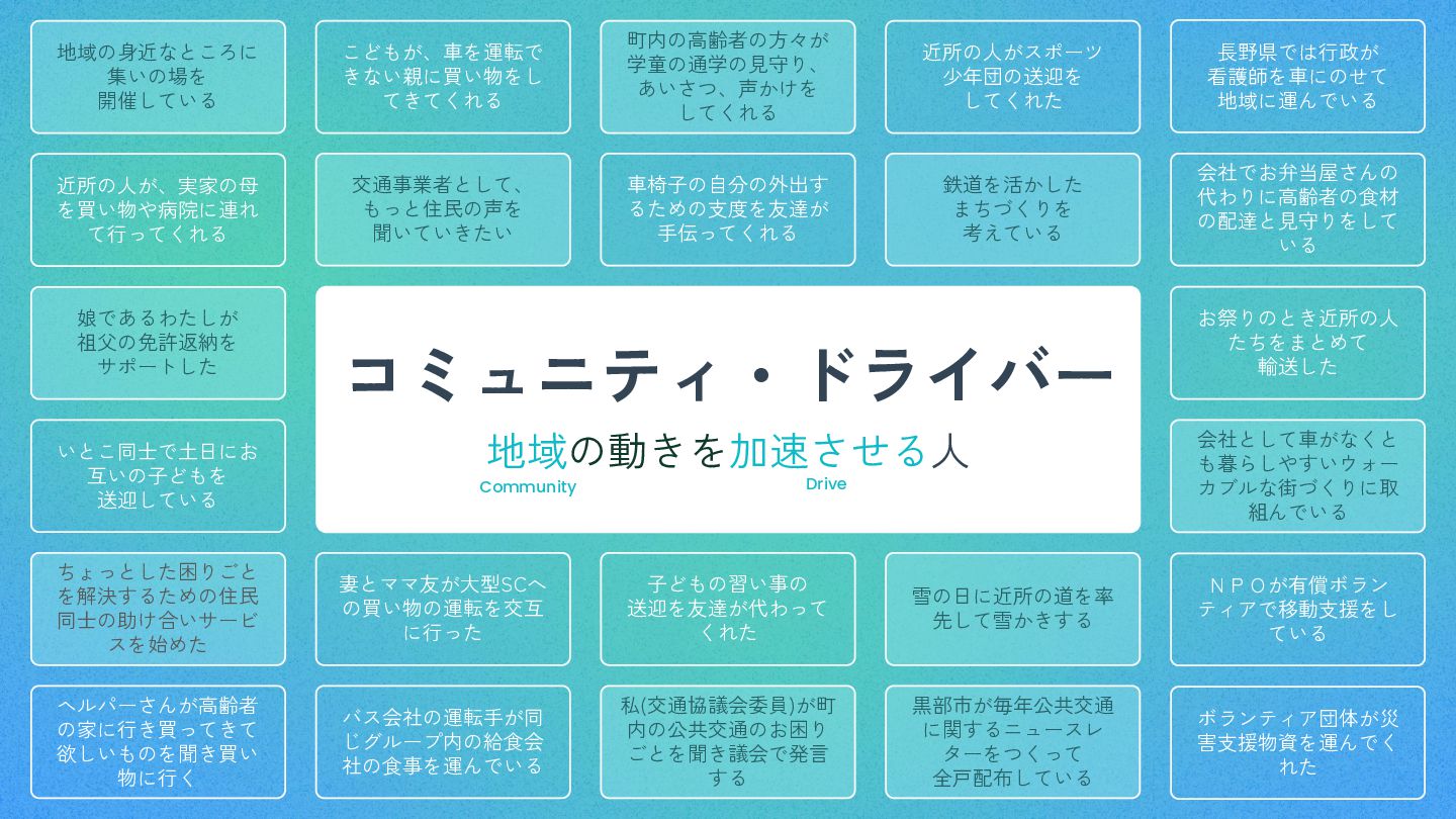 を解決するための住民 同士の助け合いサービ スを始めた 妻とママ友が大型SCへ の買い物の運転を交互 に行った 子どもの習い事の 送迎を友達が代わって くれた 雪の日に近所の道を率 先して雪かきする 鉄道を活かした まちづくりを 考えている 娘であるわたしが 祖父の免許返納を サポートした NPOが有償ボラン ティアで移動支援をし ている 会社でお弁当屋さんの 代わりに高齢者の食材 の配達と見守りをして いる お祭りのとき近所の人 たちをまとめて 輸送した 会社として車がなくと も暮らしやすいウォー カブルな街づくりに取 組んでいる いとこ同士で土日にお 互いの子どもを 送迎している バス会社の運転手が同 じグループ内の給食会 社の食事を運んでいる 私(交通協議会委員)が町 内の公共交通のお困り ごとを聞き議会で発言 する ヘルパーさんが高齢者 の家に行き買ってきて 欲しいものを聞き買い 物に行く ボランティア団体が災 害支援物資を運んでく れた 黒部市が毎年公共交通 に関するニュースレ ターをつくって 全戸配布している 長野県では行政が 看護師を車にのせて 地域に運んでいる こどもが、車を運転で きない親に買い物をし てきてくれる 町内の高齢者の方々が 学童の通学の見守り、 あいさつ、声かけを してくれる 地域の身近なところに 集いの場を 開催している 近所の人がスポーツ 少年団の送迎を してくれた コミュニティ・ドライバー 地域の動きを加速させる人 Community Drive