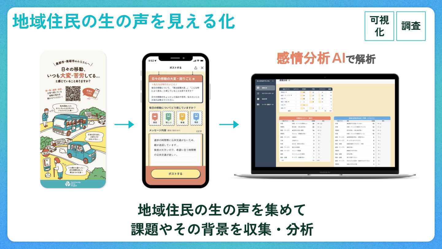 地域住民の生の声を集めて 課題やその背景を収集・分析 感情分析AIで解析 調査 可視 化 地域住民の生の声を見える化