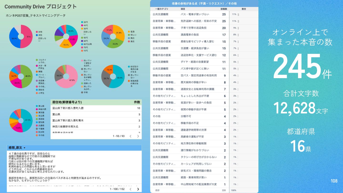 108 オンライン上で 集まった本音の数 245件 合計文字数 12,628文字 都道府県 16県