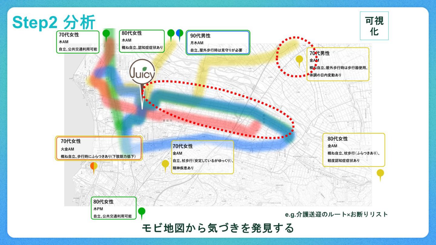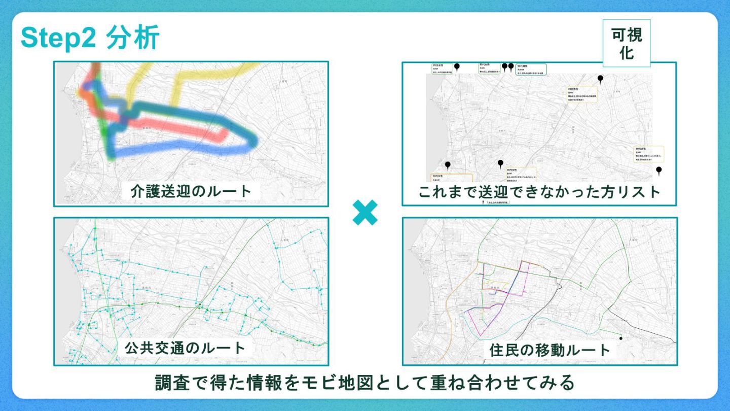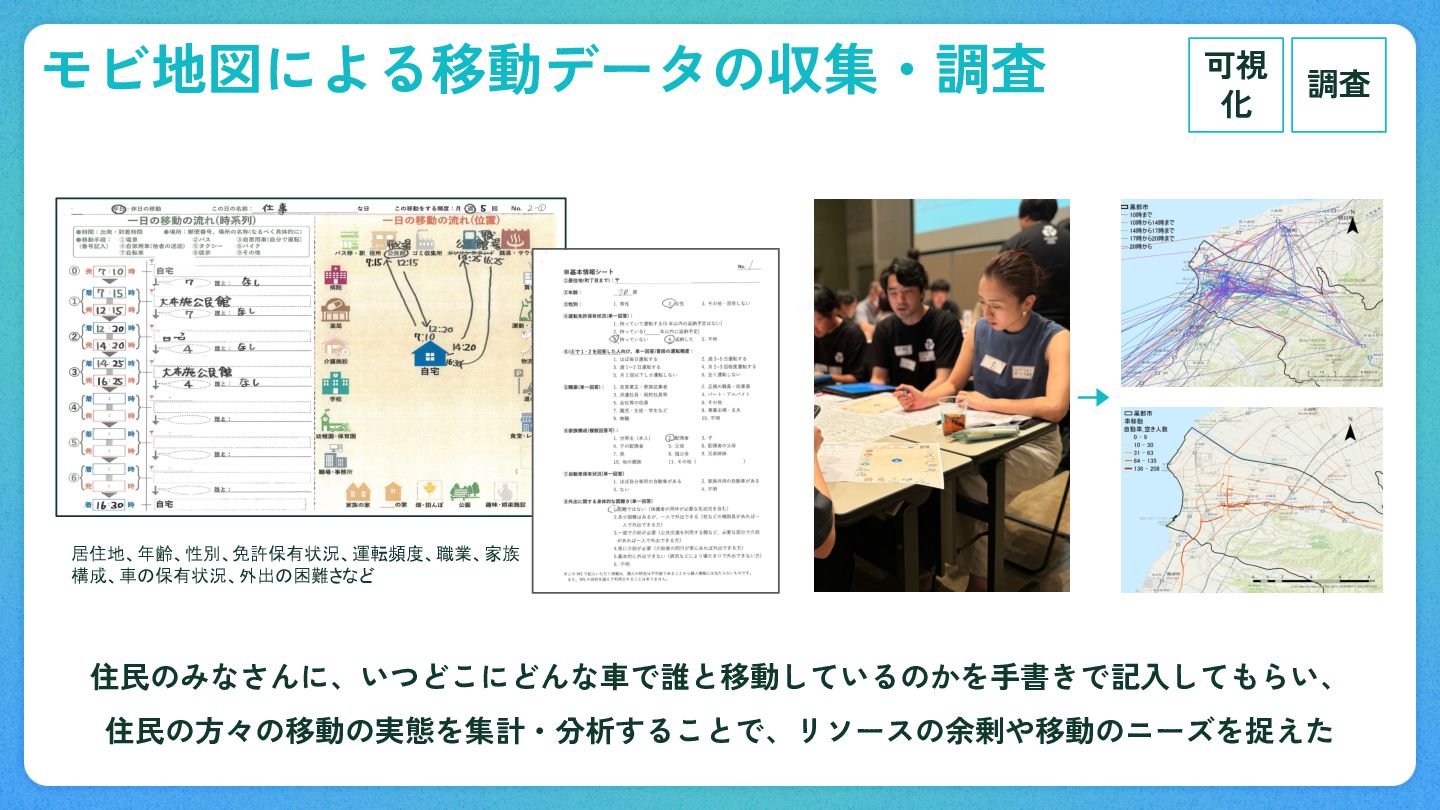 調査 可視 化 モビ地図による移動データの収集・調査 住民のみなさんに、いつどこにどんな車で誰と移動しているのかを手書きで記入してもらい、 住民の方々の移動の実態を集計・分析することで、リソースの余剰や移動のニーズを捉えた 居住地、年齢、性別、免許保有状況、運転頻度、職業、家族 構成、車の保有状況、外出の困難さなど