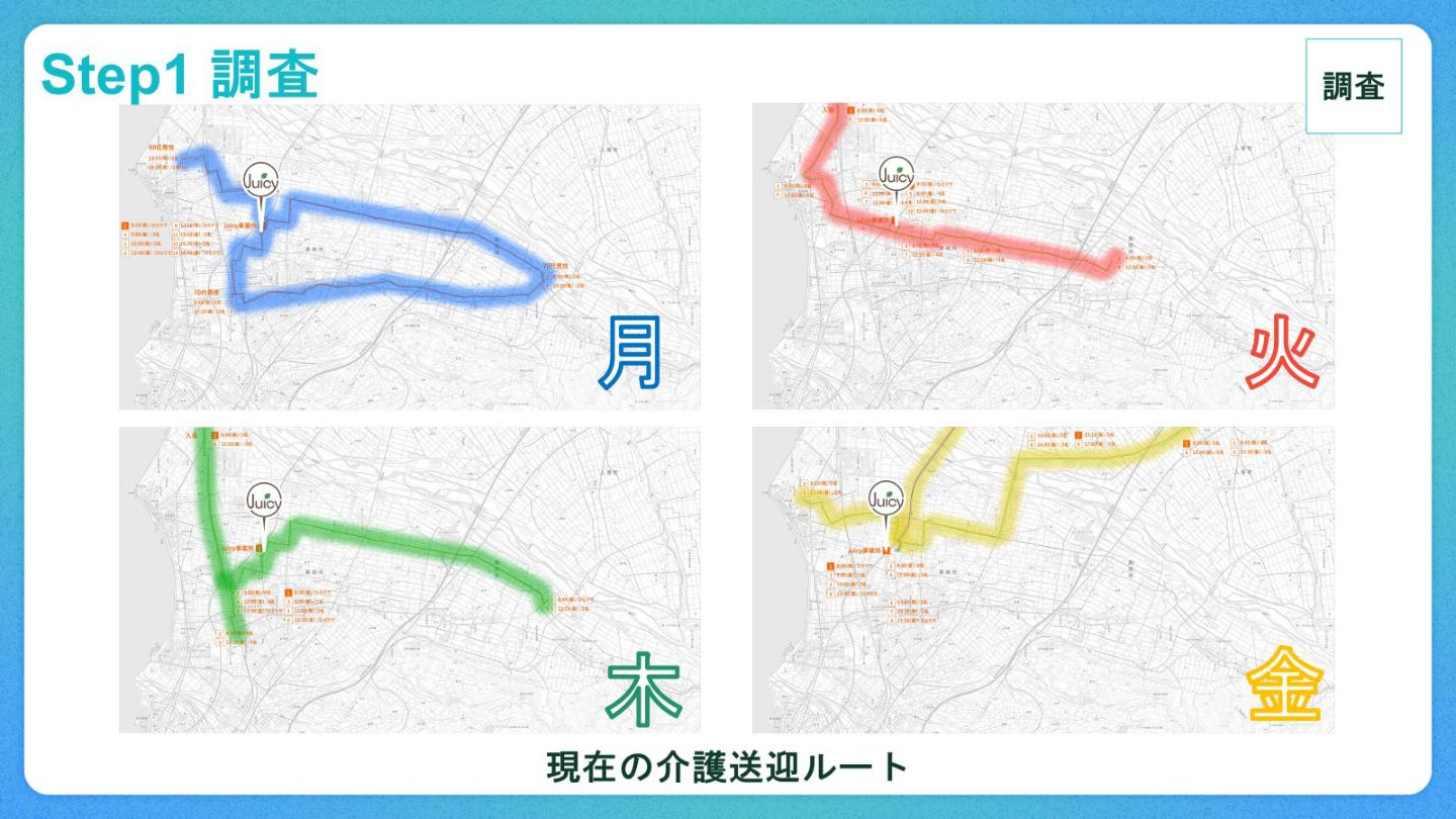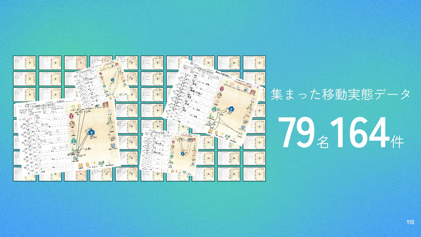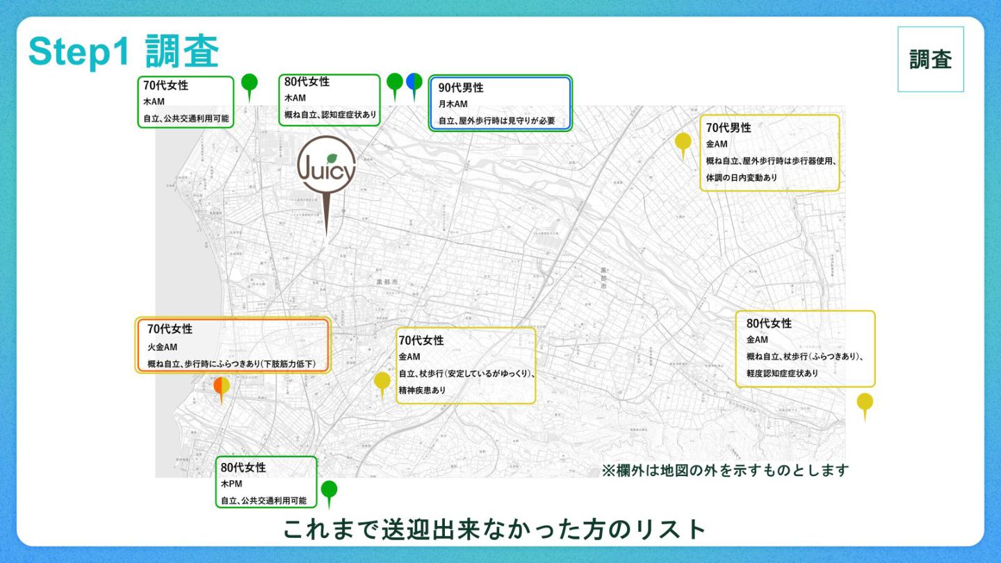 調査 可視 化 モビ地図による移動データの収集・調査 住民のみなさんに、いつどこにどんな車で誰と移動しているのかを手書きで記入してもらい、 住民の方々の移動の実態を集計・分析することで、リソースの余剰や移動のニーズを捉えた 居住地、年齢、性別、免許保有状況、運転頻度、職業、家族 構成、車の保有状況、外出の困難さなど