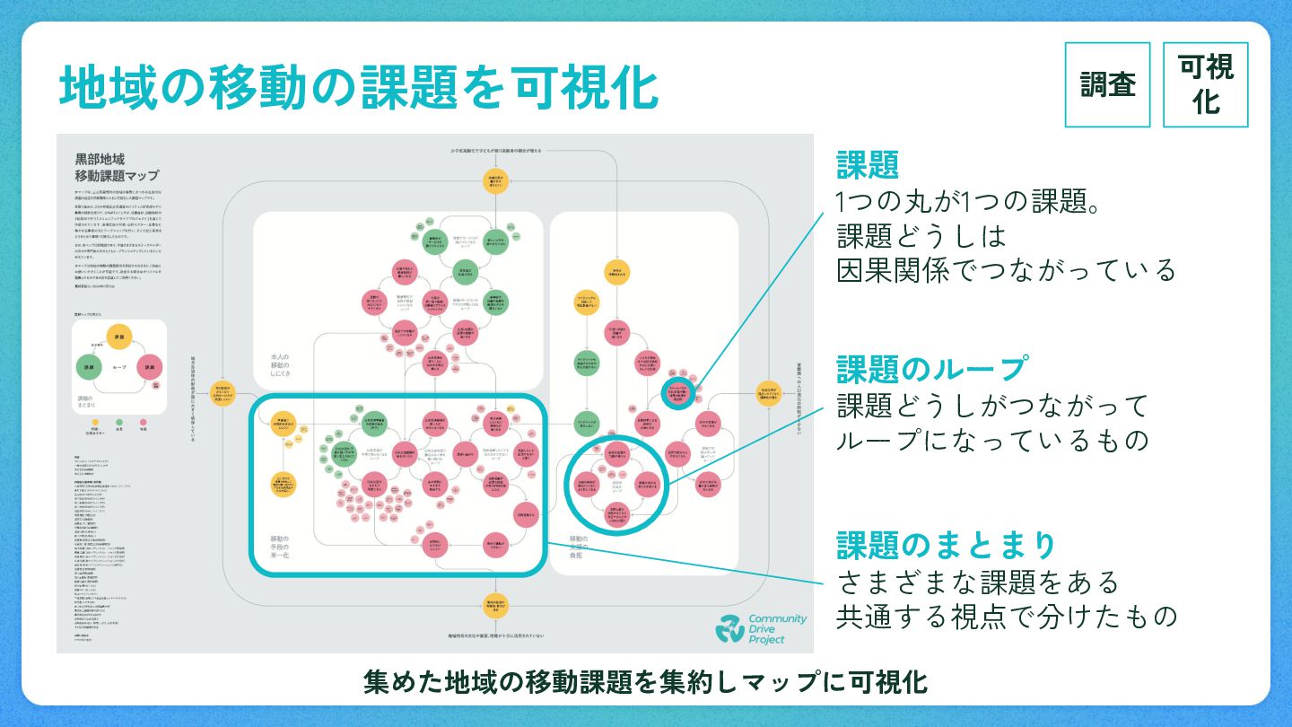 地域の移動の課題を可視化 可視 化 調査 課題のまとまり さまざまな課題をある 共通する視点で分けたもの 課題 1つの丸が1つの課題。 課題どうしは
