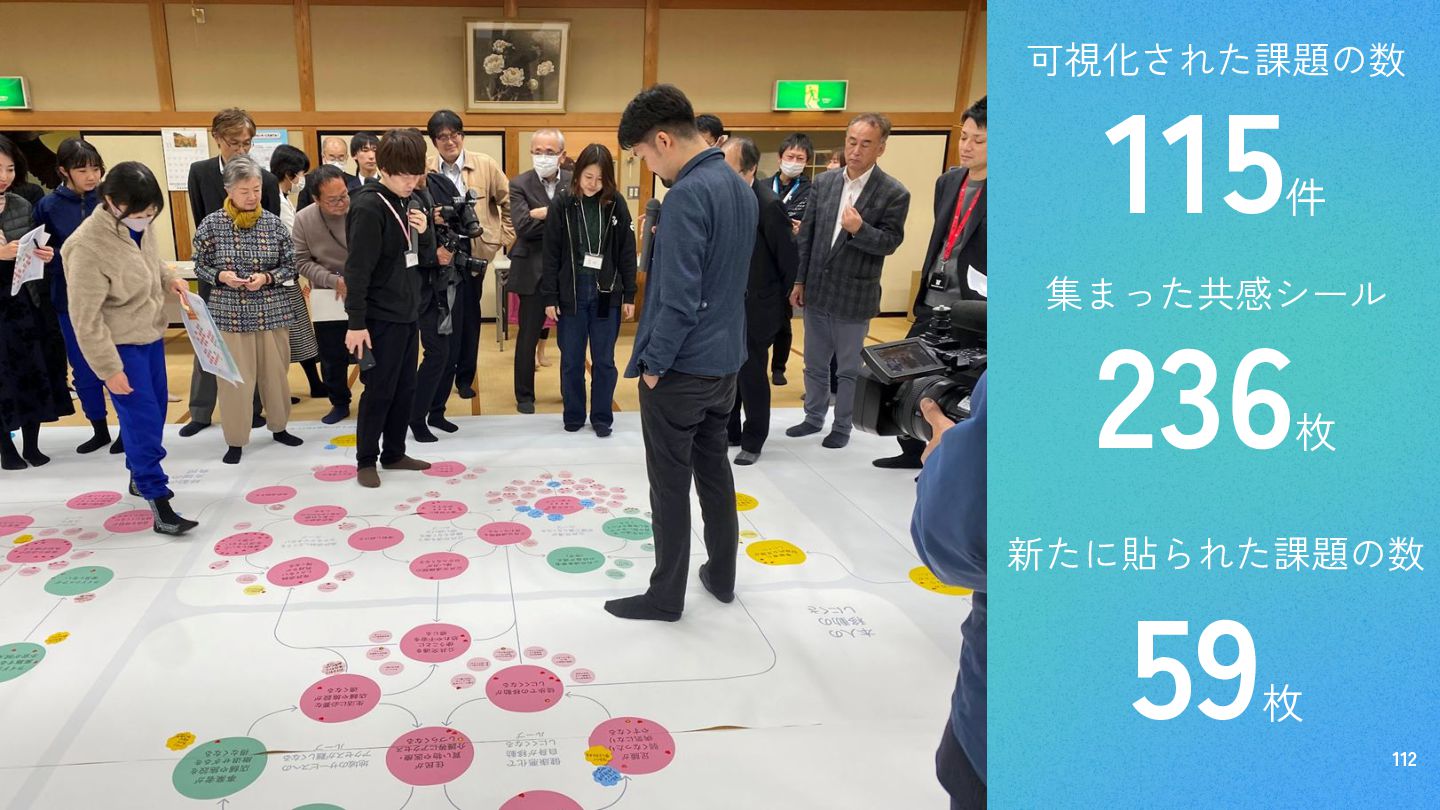 112 可視化された課題の数 115件 集まった共感シール 236枚 新たに貼られた課題の数 59枚