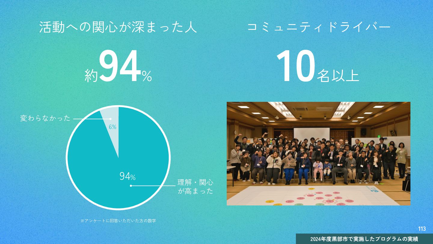 113 活動への関心が深まった人 約 94% コミュニティドライバー 10名以上 理解・関心 が高まった 変わらなかった 94%
