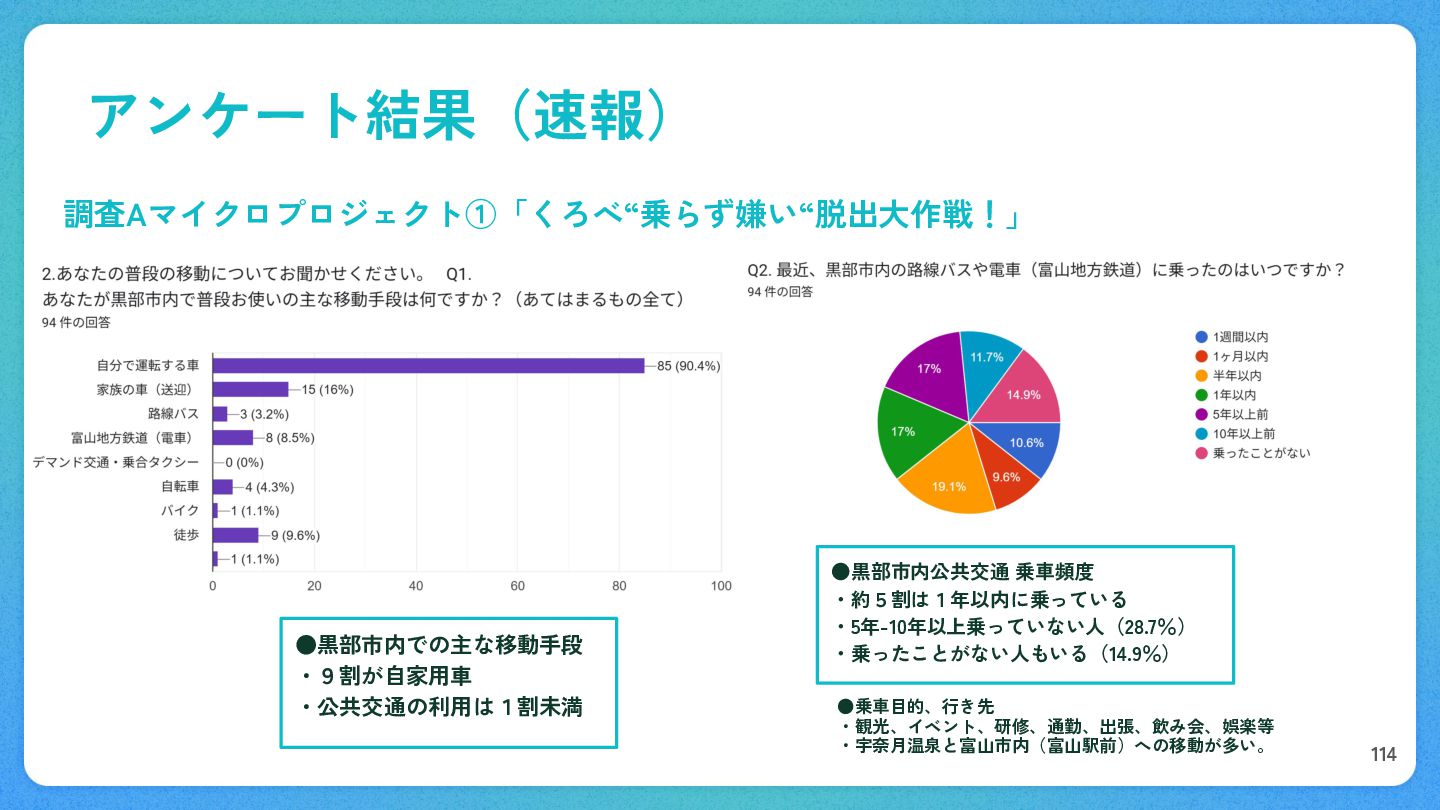 アンケート結果(速報) 調査Aマイクロプロジェクト①「くろべ“乗らず嫌い“脱出大作戦!」 114 •黒部市内での主な移動手段 ・9割が自家用車 ・公共交通の利用は1割未満 •黒部市内公共交通 乗車頻度 ・約5割は1年以内に乗っている ・5年-10年以上乗っていない人(28.7%)