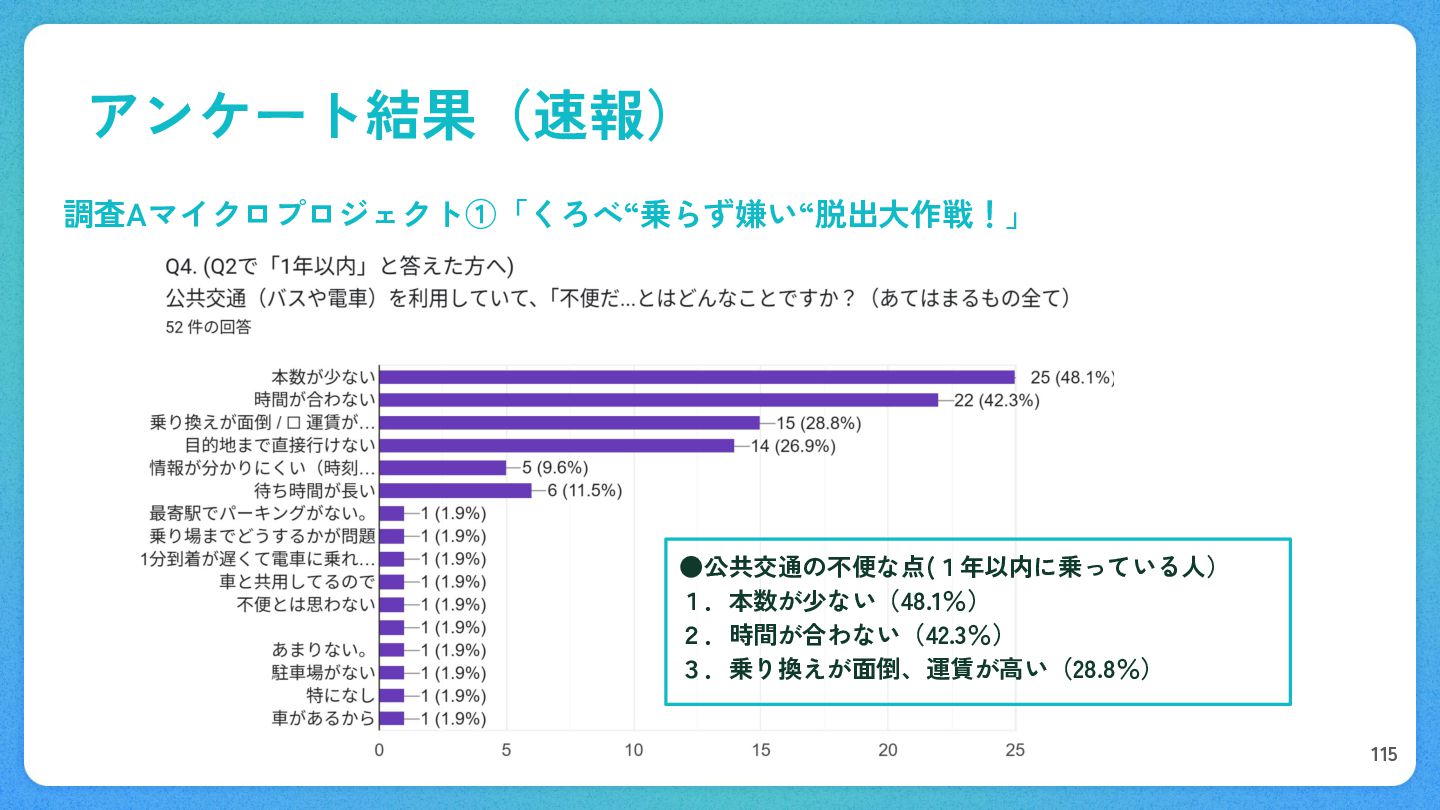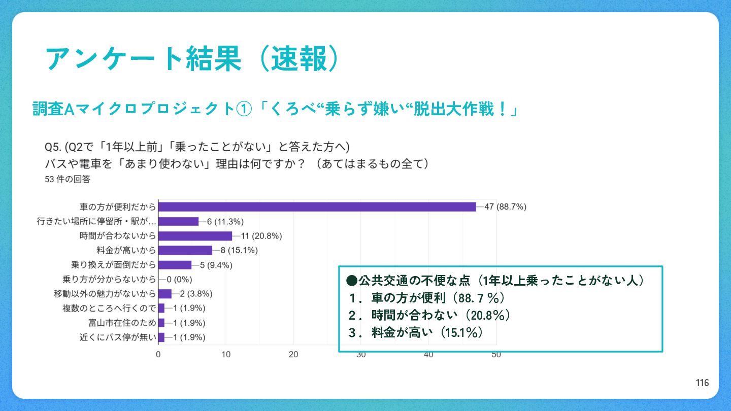 アンケート結果(速報) 調査Aマイクロプロジェクト①「くろべ“乗らず嫌い“脱出大作戦!」 115 •公共交通の不便な点(1年以内に乗っている人) 1.本数が少ない(48.1%) 2.時間が合わない(42.3%) 3.乗り換えが面倒、運賃が高い(28.8%)