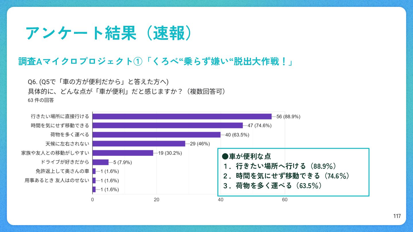アンケート結果(速報) 調査Aマイクロプロジェクト①「くろべ“乗らず嫌い“脱出大作戦!」 117 •車が便利な点 1.行きたい場所へ行ける(88.9%) 2.時間を気にせず移動できる(74.6%) 3.荷物を多く運べる(63.5%)