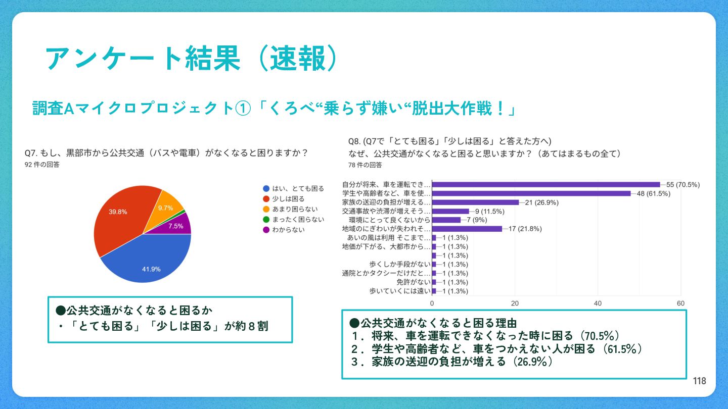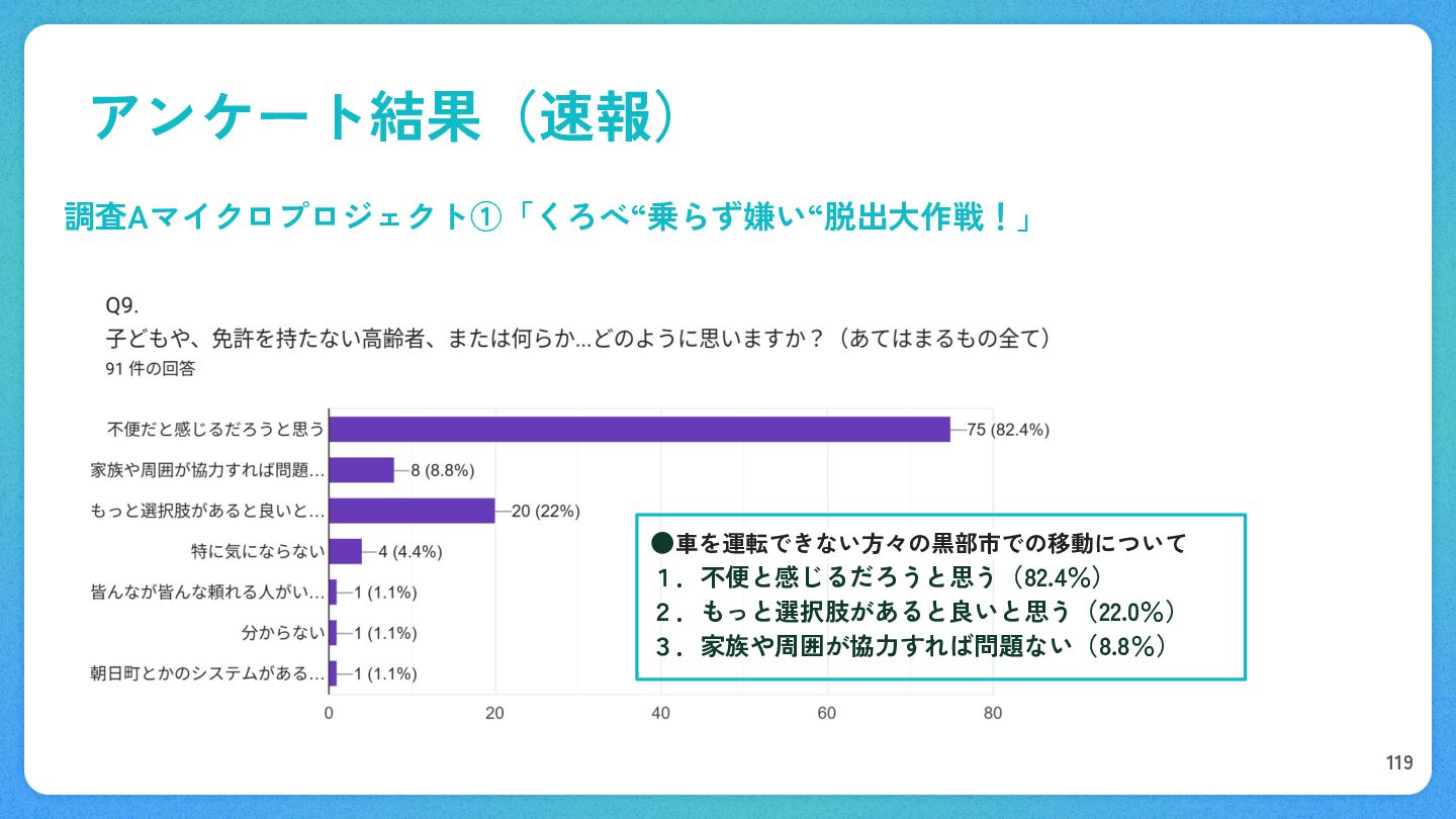 アンケート結果(速報) 調査Aマイクロプロジェクト①「くろべ“乗らず嫌い“脱出大作戦!」 119 •車を運転できない方々の黒部市での移動について 1.不便と感じるだろうと思う(82.4%) 2.もっと選択肢があると良いと思う(22.0%) 3.家族や周囲が協力すれば問題ない(8.8%)