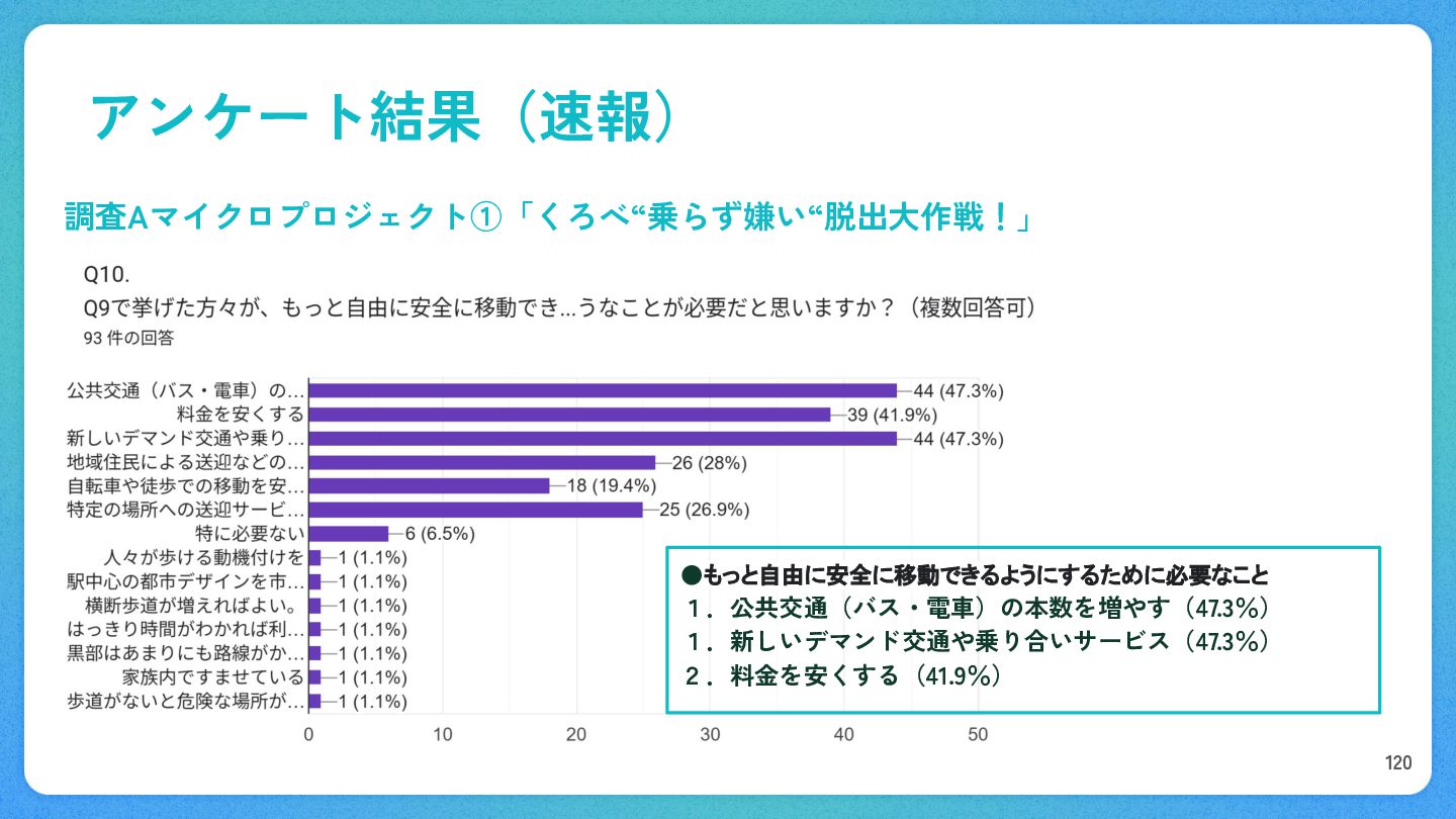 アンケート結果(速報) 調査Aマイクロプロジェクト①「くろべ“乗らず嫌い“脱出大作戦!」 120 •もっと自由に安全に移動できるようにするために必要なこと 1.公共交通(バス・電車)の本数を増やす(47.3%) 1.新しいデマンド交通や乗り合いサービス(47.3%) 2.料金を安くする(41.9%)