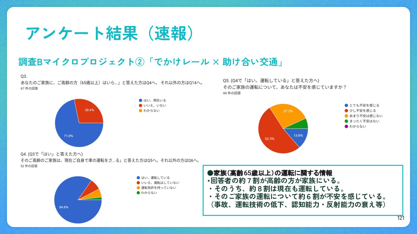アンケート結果(速報) 調査Bマイクロプロジェクト②「でかけレール × 助け合い交通」 121 •家族(高齢65歳以上)の運転に関する情報 ・回答者の約7割が高齢の方が家族にいる。 ・そのうち、約8割は現在も運転している。 ・そのご家族の運転について約6割が不安を感じている。 (事故、運転技術の低下、認知能力・反射能力の衰え等)