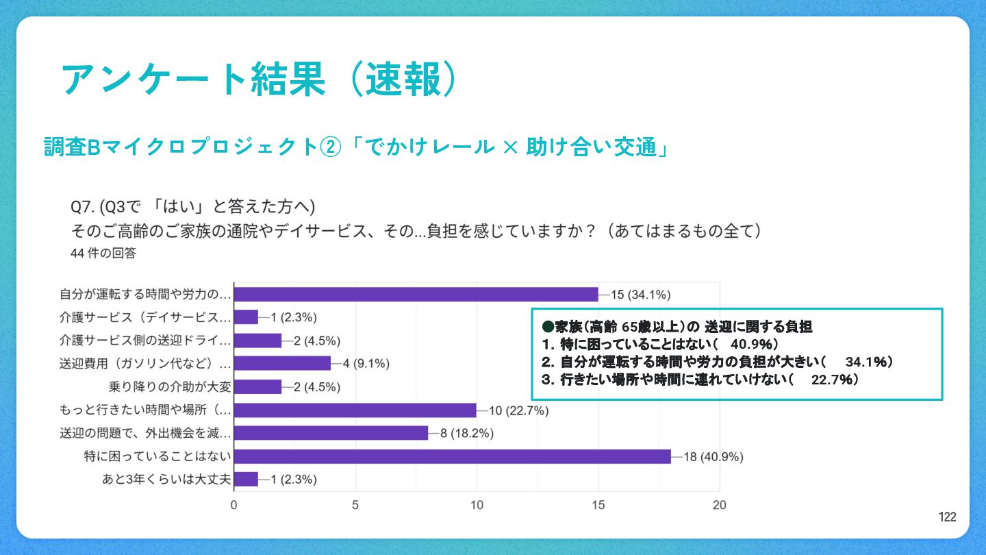 アンケート結果(速報) 調査Bマイクロプロジェクト②「でかけレール × 助け合い交通」 122 •家族(高齢 65歳以上)の 送迎に関する負担 1.特に困っていることはない( 40.9%)