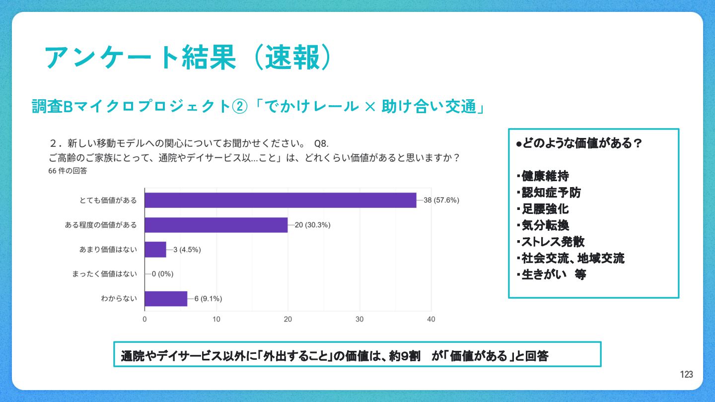 アンケート結果(速報) 調査Bマイクロプロジェクト②「でかけレール × 助け合い交通」 123 •どのような価値がある? ・健康維持 ・認知症予防 ・足腰強化 ・気分転換