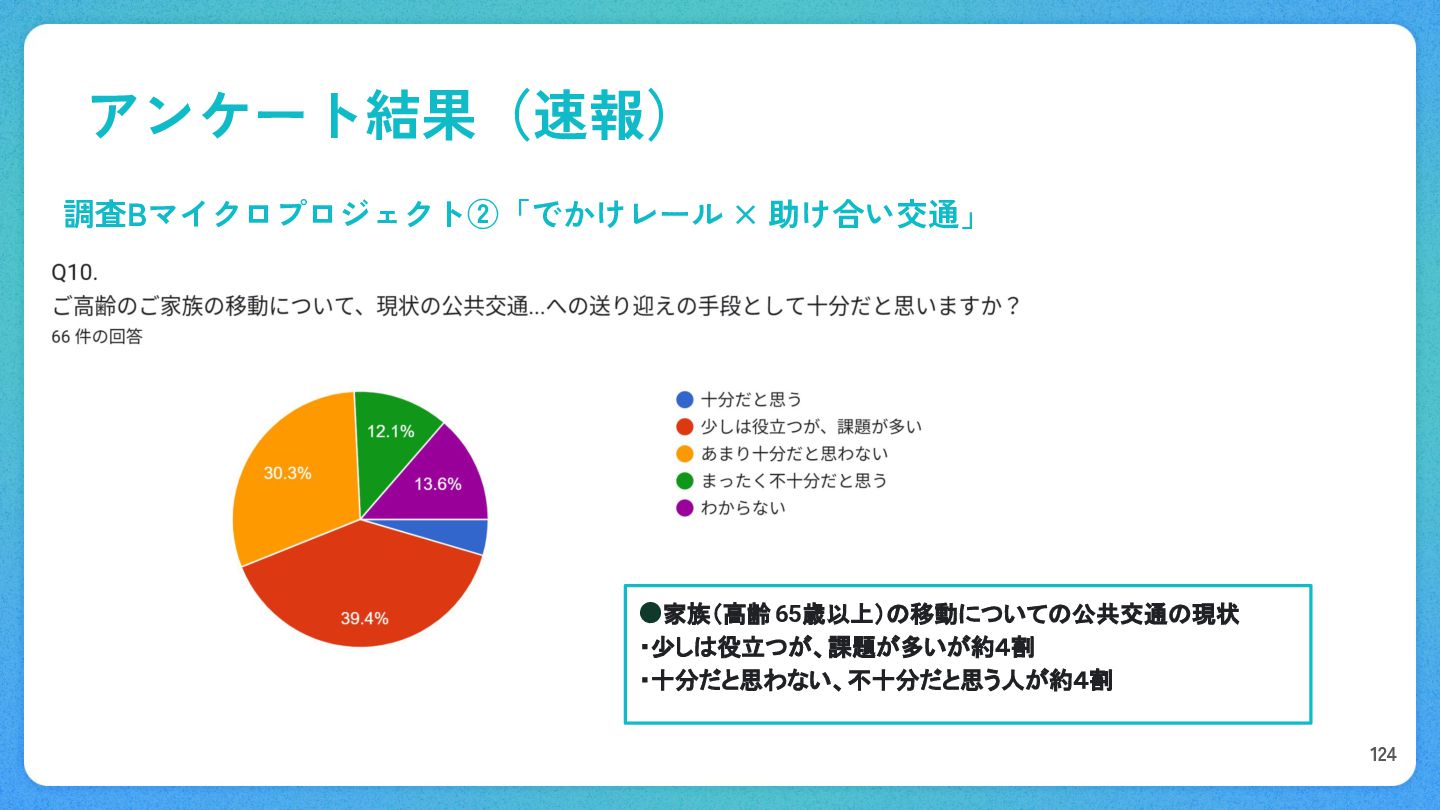 アンケート結果(速報) 調査Bマイクロプロジェクト②「でかけレール × 助け合い交通」 124 •家族(高齢 65歳以上)の移動についての公共交通の現状 ・少しは役立つが、課題が多いが約4割 ・十分だと思わない、不十分だと思う人が約4割