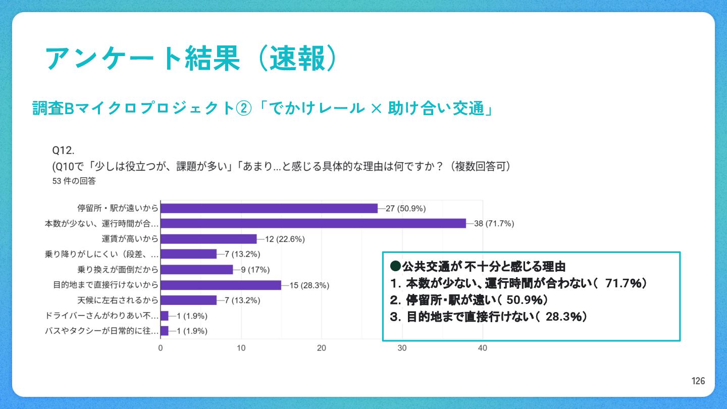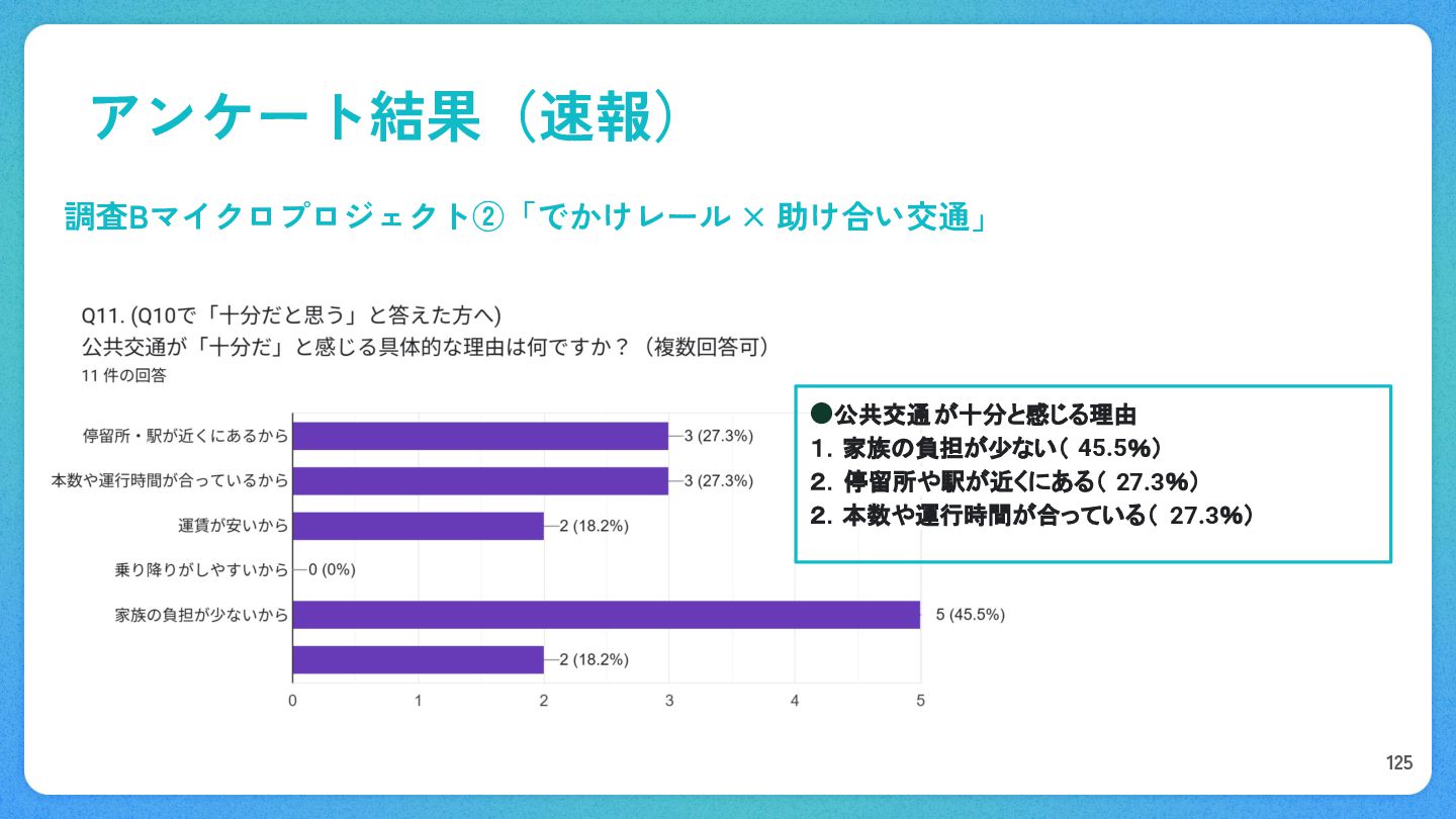 アンケート結果(速報) 調査Bマイクロプロジェクト②「でかけレール × 助け合い交通」 125 •公共交通が十分と感じる理由 1.家族の負担が少ない( 45.5%) 2.停留所や駅が近くにある( 27.3%)