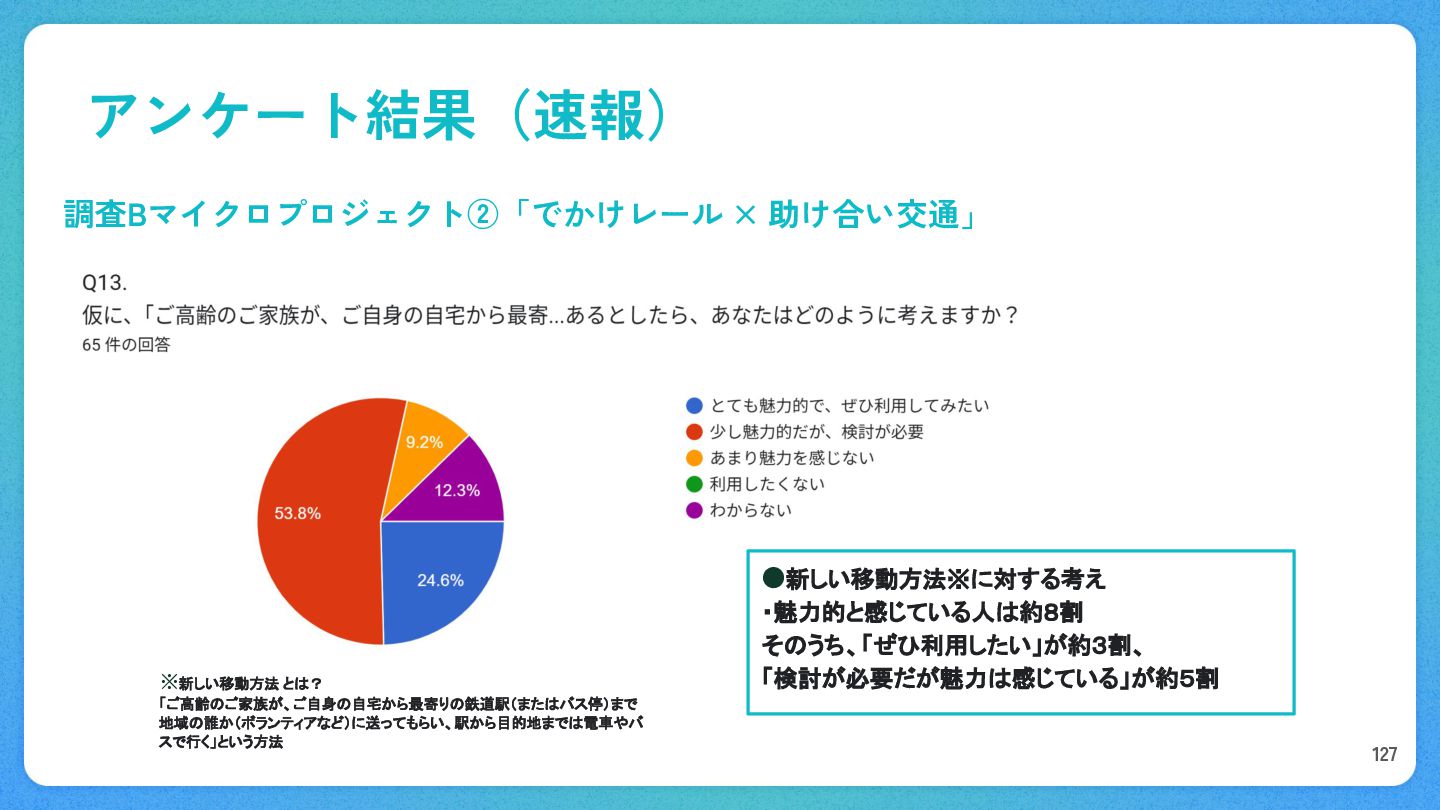 アンケート結果(速報) 調査Bマイクロプロジェクト②「でかけレール × 助け合い交通」 127 •新しい移動方法※に対する考え ・魅力的と感じている人は約8割 そのうち、「ぜひ利用したい」が約3割、 「検討が必要だが魅力は感じている」が約5割 ※新しい移動方法