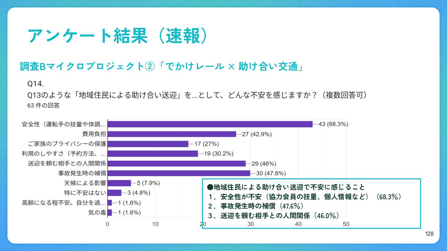 アンケート結果(速報) 調査Bマイクロプロジェクト②「でかけレール × 助け合い交通」 128 •地域住民による助け合い送迎で不安に感じること 1.安全性が不安(協力会員の技量、個人情報など)(68.3%) 2.事故発生時の補償(47.6%) 3.送迎を頼む相手との人間関係(46.0%)