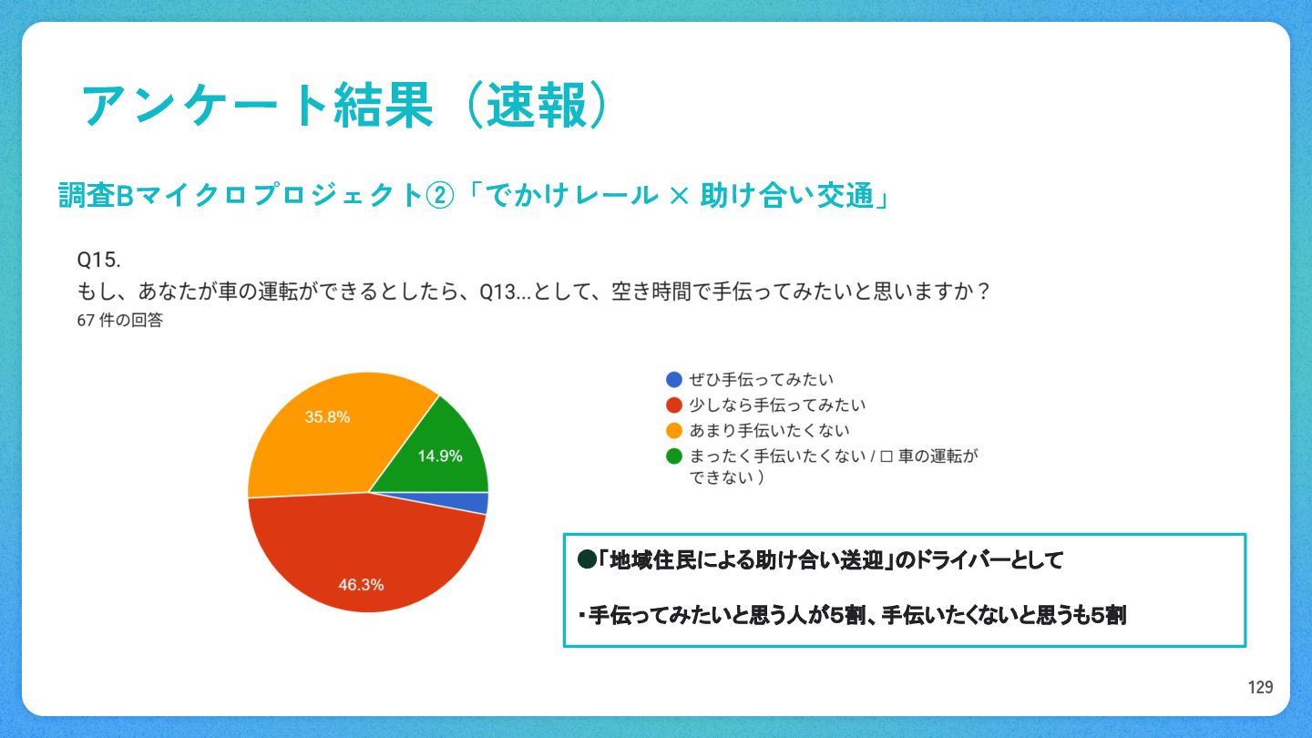 アンケート結果(速報) 調査Bマイクロプロジェクト②「でかけレール × 助け合い交通」 129 •「地域住民による助け合い送迎」のドライバーとして ・手伝ってみたいと思う人が5割、手伝いたくないと思うも5割