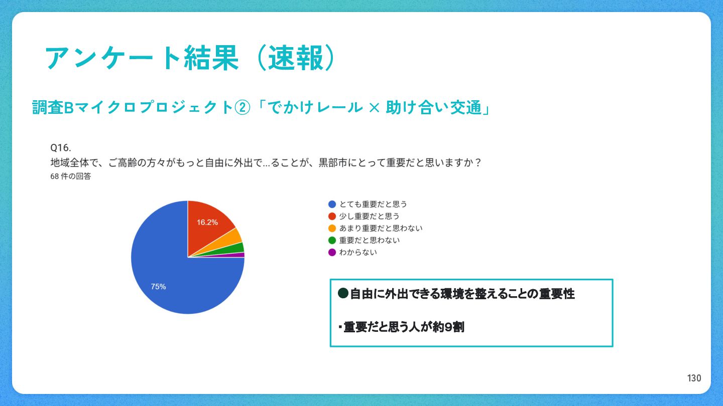 アンケート結果(速報) 調査Bマイクロプロジェクト②「でかけレール × 助け合い交通」 130 •自由に外出できる環境を整えることの重要性 ・重要だと思う人が約9割