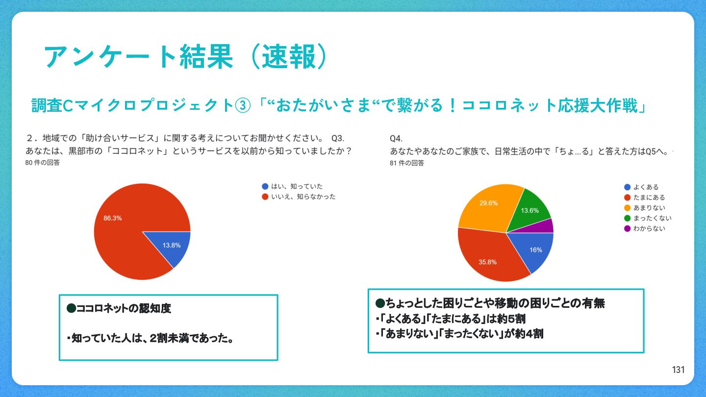 アンケート結果(速報) 調査Cマイクロプロジェクト③「“おたがいさま“で繋がる!ココロネット応援大作戦」 131 •ココロネットの認知度 ・知っていた人は、2割未満であった。 •ちょっとした困りごとや移動の困りごとの有無 ・「よくある」「たまにある」は約5割 ・「あまりない」「まったくない」が約4割