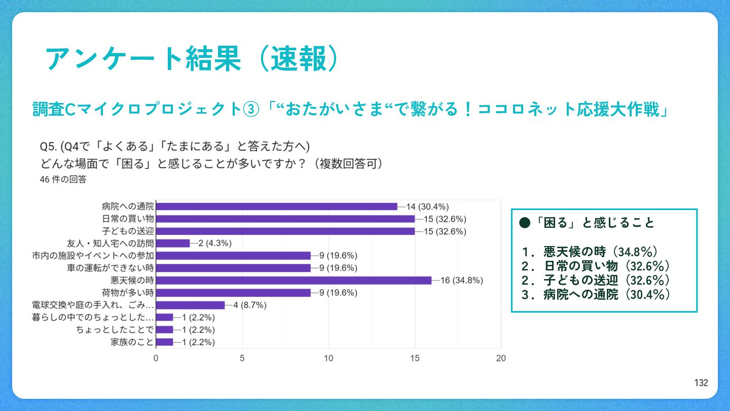 アンケート結果(速報) 調査Cマイクロプロジェクト③「“おたがいさま“で繋がる!ココロネット応援大作戦」 132 •「困る」と感じること 1.悪天候の時(34.8%) 2.日常の買い物(32.6%) 2.子どもの送迎(32.6%) 3.病院への通院(30.4%)