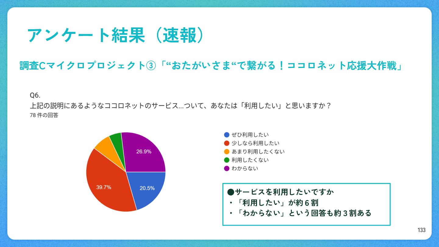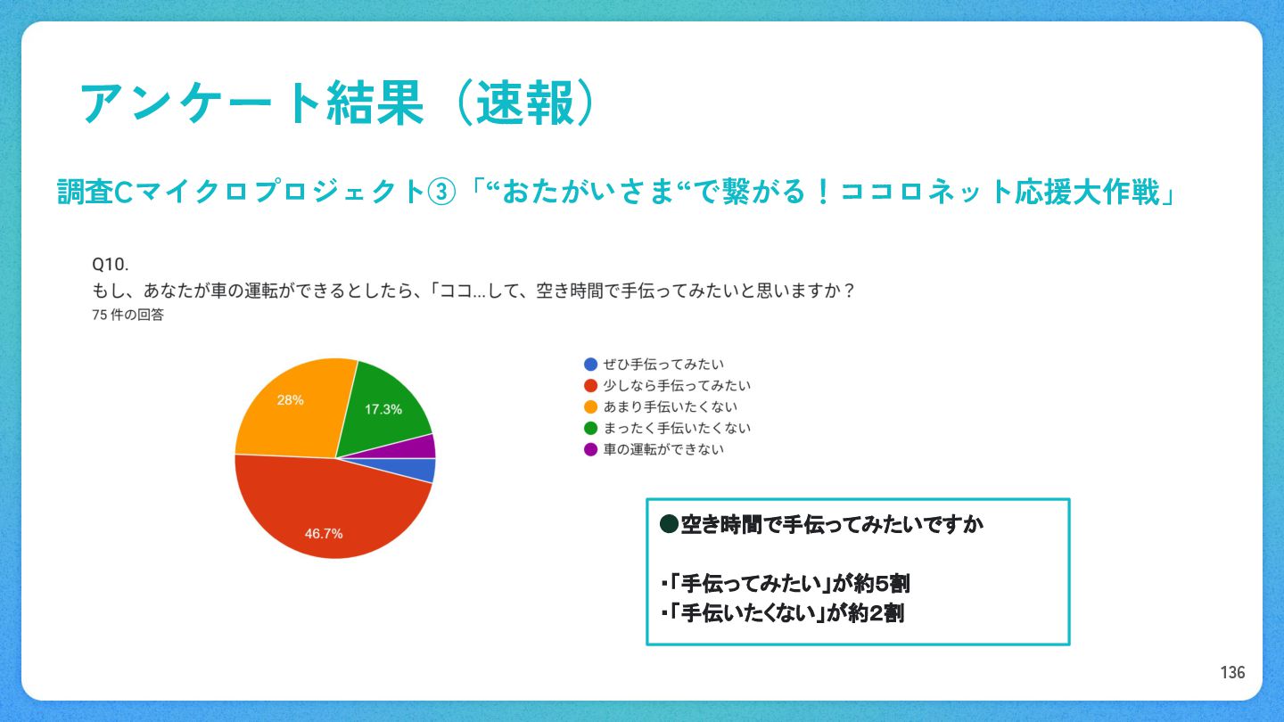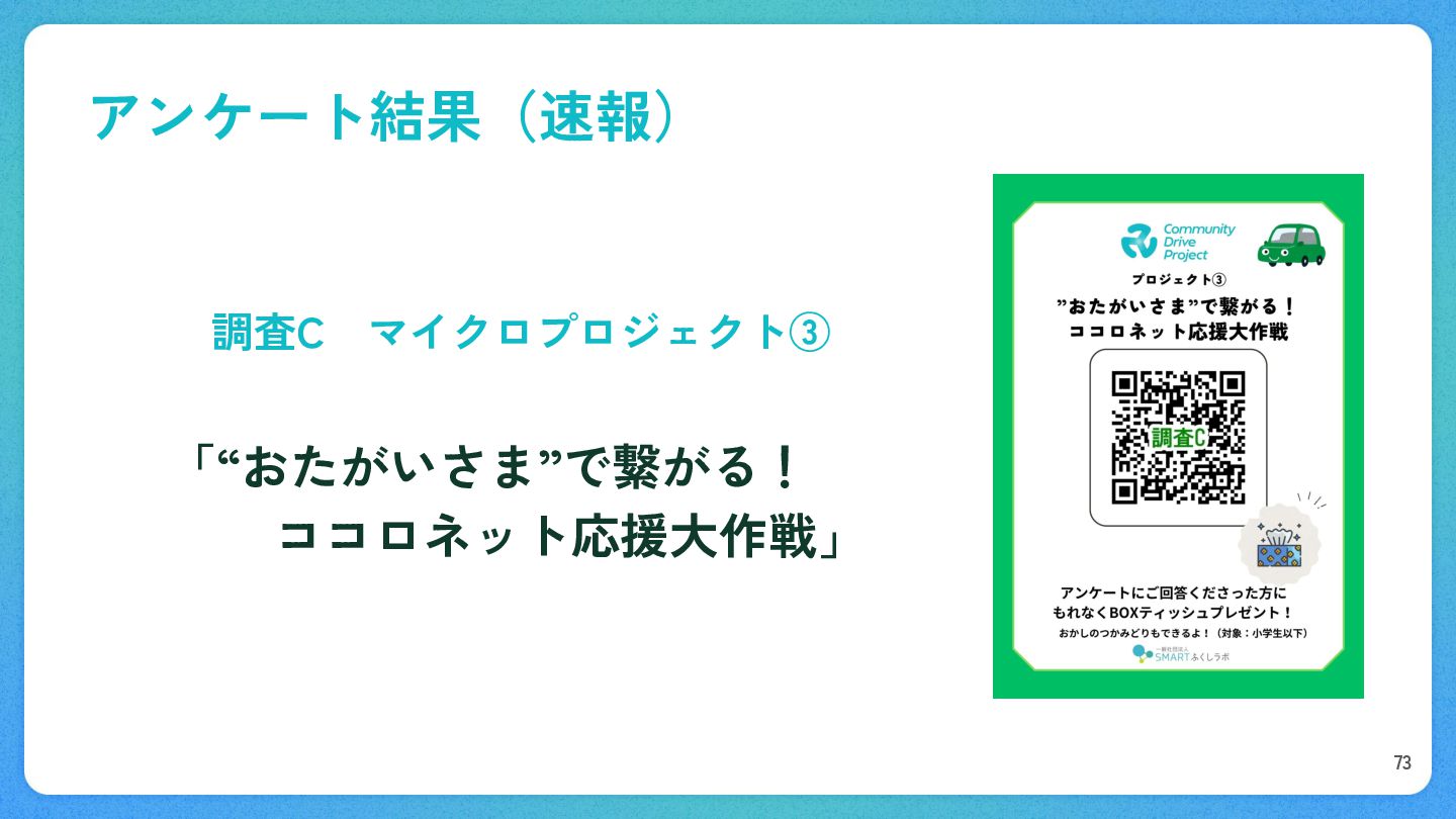 アンケート結果(速報) 調査C マイクロプロジェクト③ 「“おたがいさま”で繋がる! ココロネット応援大作戦」 73
