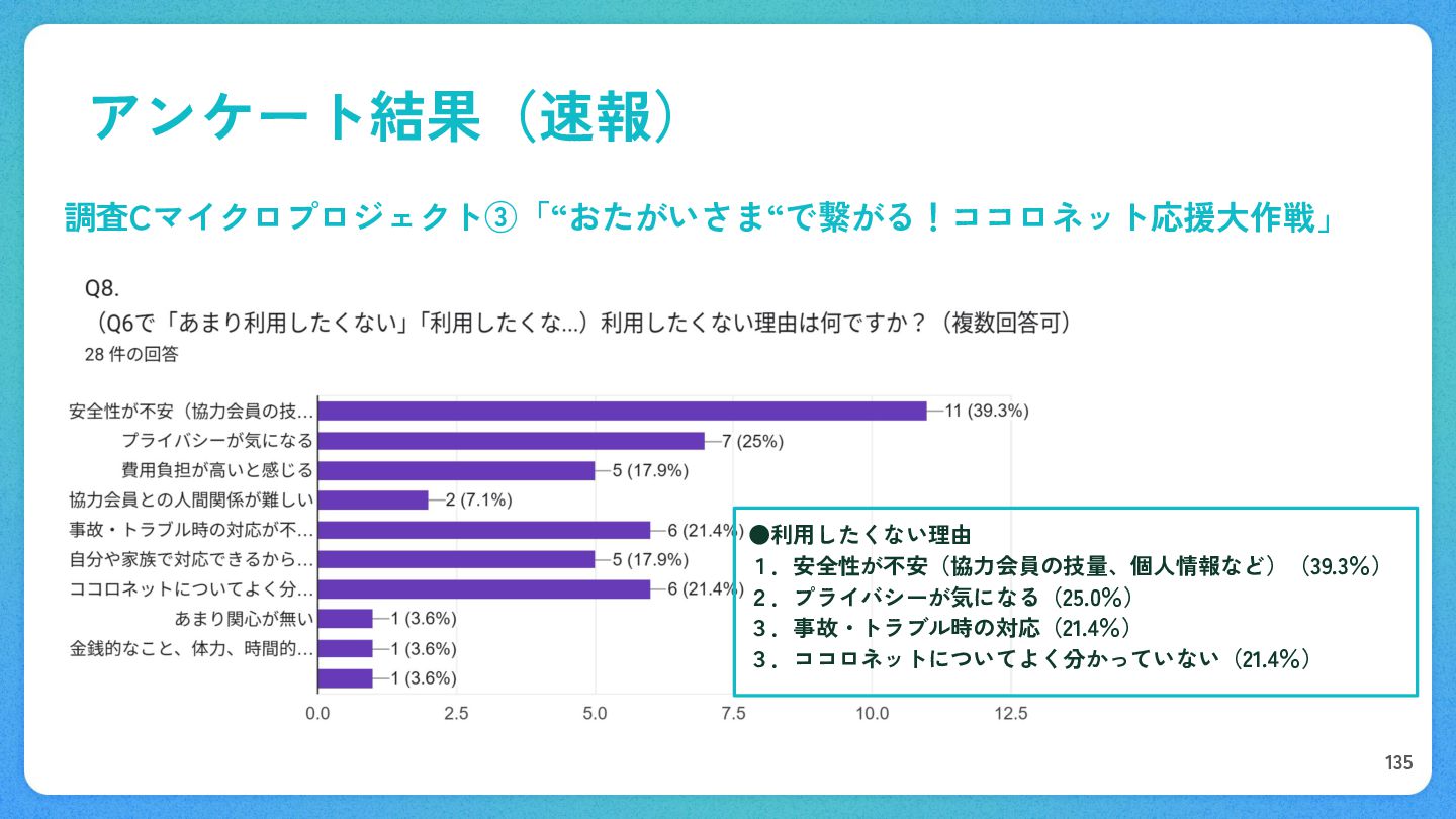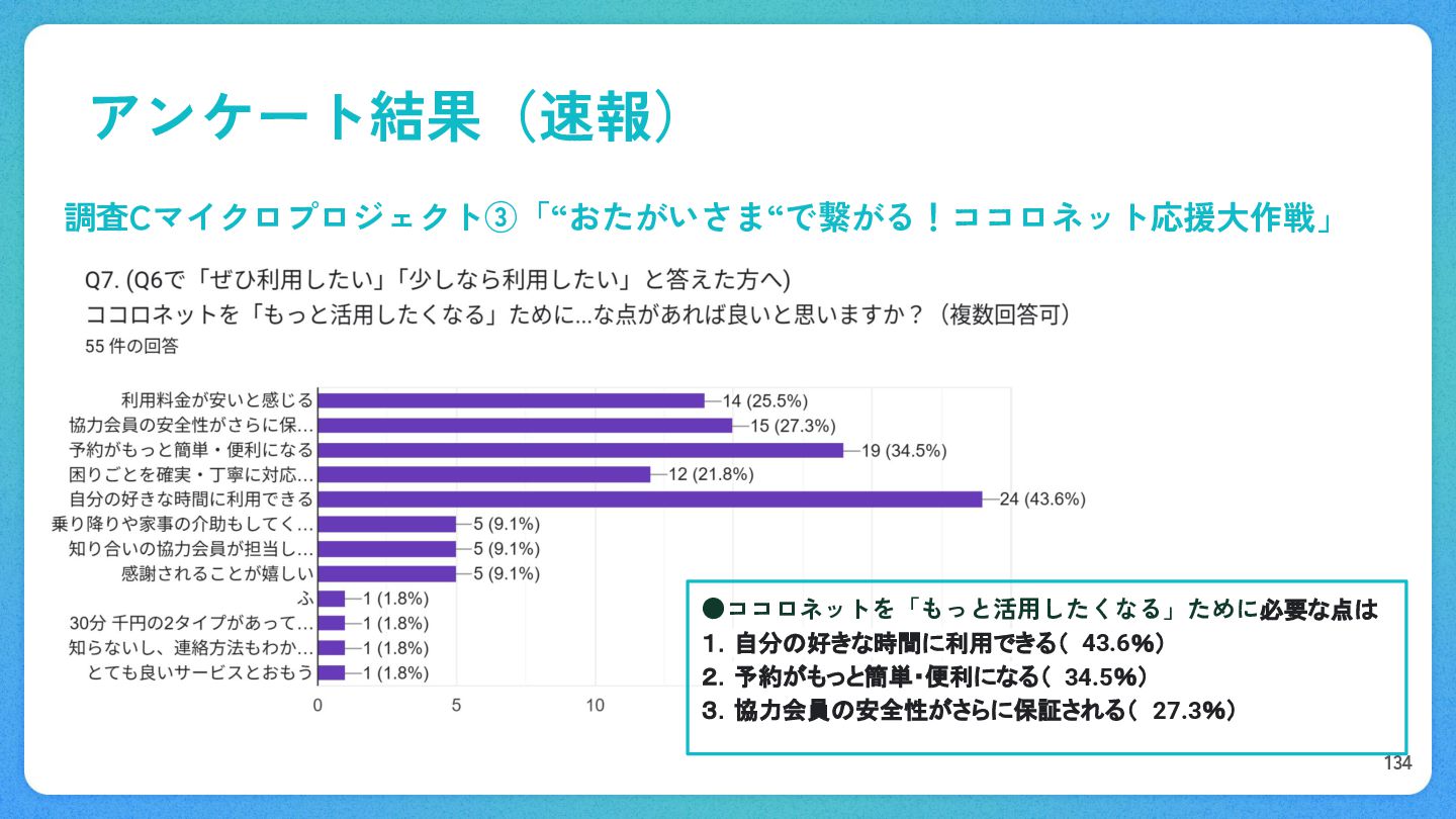 アンケート結果(速報) 調査Cマイクロプロジェクト③「“おたがいさま“で繋がる!ココロネット応援大作戦」 134 •ココロネットを「もっと活用したくなる」ために必要な点は 1.自分の好きな時間に利用できる( 43.6%) 2.予約がもっと簡単・便利になる( 34.5%) 3.協力会員の安全性がさらに保証される( 27.3%)