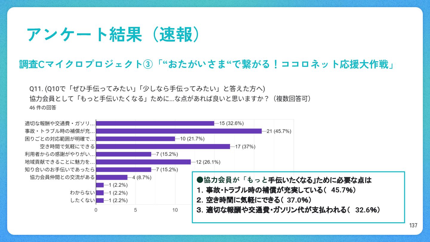 アンケート結果(速報) 調査Cマイクロプロジェクト③「“おたがいさま“で繋がる!ココロネット応援大作戦」 137 •協力会員が「もっと手伝いたくなる」ために必要な点は 1.事故・トラブル時の補償が充実している( 45.7%) 2.空き時間に気軽にできる( 37.0%) 3.適切な報酬や交通費・ガソリン代が支払われる( 32.6%)