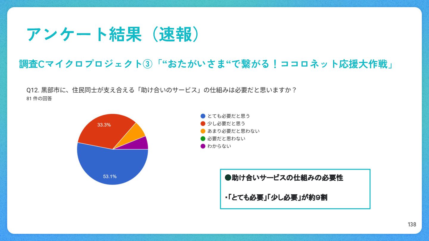 アンケート結果(速報) 調査Cマイクロプロジェクト③「“おたがいさま“で繋がる!ココロネット応援大作戦」 138 •助け合いサービスの仕組みの必要性 ・「とても必要」「少し必要」が約9割