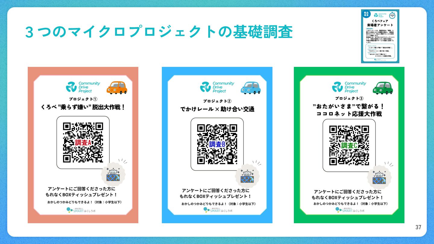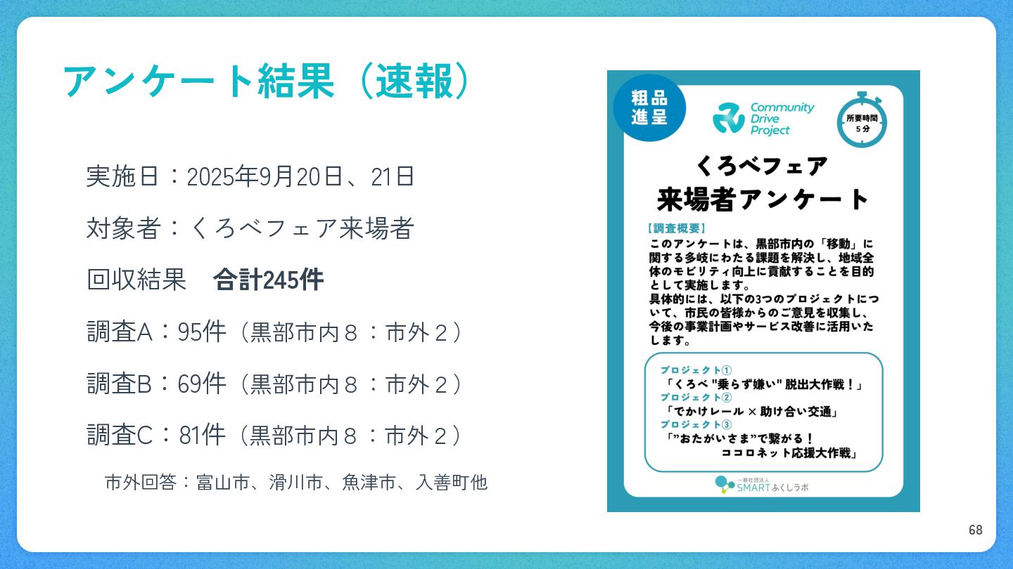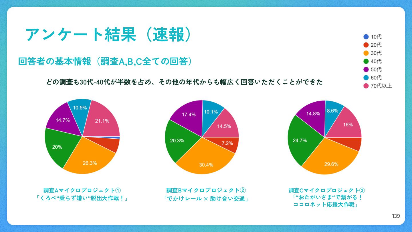 アンケート結果(速報) 回答者の基本情報(調査A,B,C全ての回答) 139 調査Aマイクロプロジェクト① 「くろべ“乗らず嫌い“脱出大作戦!」 調査Bマイクロプロジェクト② 「でかけレール × 助け合い交通」 調査Cマイクロプロジェクト③