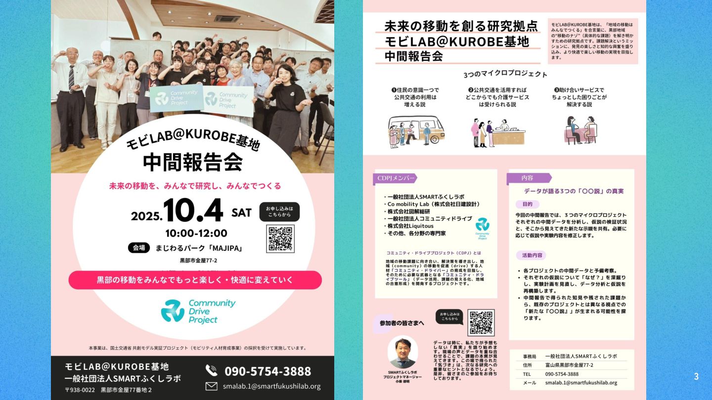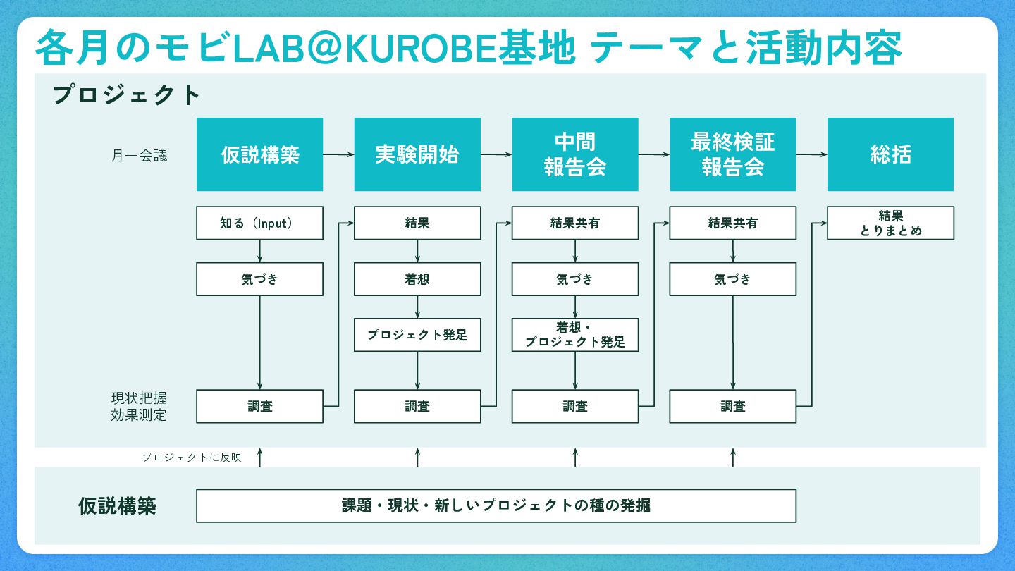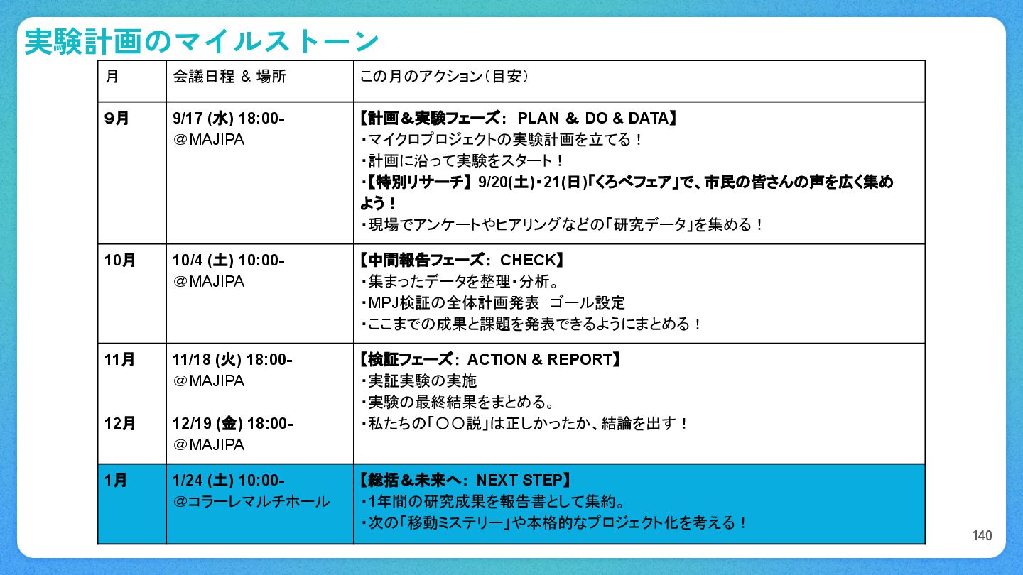 18:00- @MAJIPA 【計画&実験フェーズ: PLAN & DO & DATA】 ・マイクロプロジェクトの実験計画を立てる! ・計画に沿って実験をスタート! ・【特別リサーチ】 9/20(土)・21(日)「くろべフェア」で、市民の皆さんの声を広く集め よう! ・現場でアンケートやヒアリングなどの「研究データ」を集める! 10月 10/4 (土) 10:00- @MAJIPA 【中間報告フェーズ: CHECK】 ・集まったデータを整理・分析。 ・MPJ検証の全体計画発表 ゴール設定 ・ここまでの成果と課題を発表できるようにまとめる! 11月 12月 11/18 (火) 18:00- @MAJIPA 12/19 (金) 18:00- @MAJIPA 【検証フェーズ: ACTION & REPORT】 ・実証実験の実施 ・実験の最終結果をまとめる。 ・私たちの「〇〇説」は正しかったか、結論を出す! 1月 1/24 (土) 10:00- @コラーレマルチホール 【総括&未来へ: NEXT STEP】 ・1年間の研究成果を報告書として集約。 ・次の「移動ミステリー」や本格的なプロジェクト化を考える!