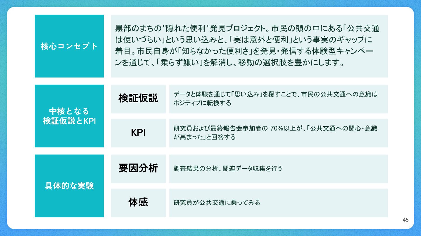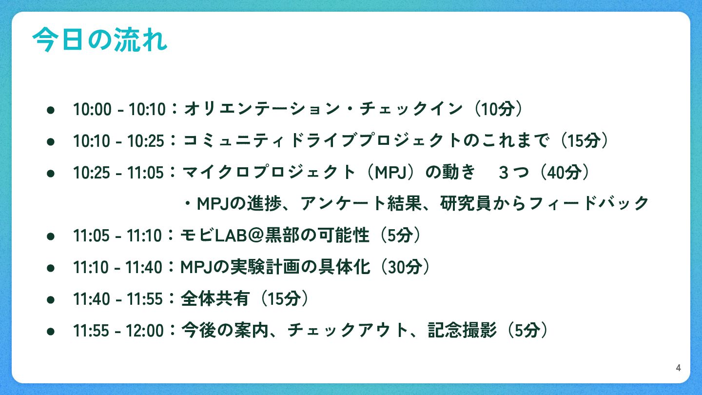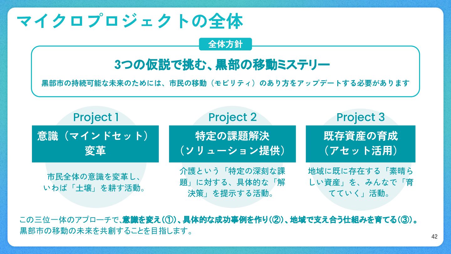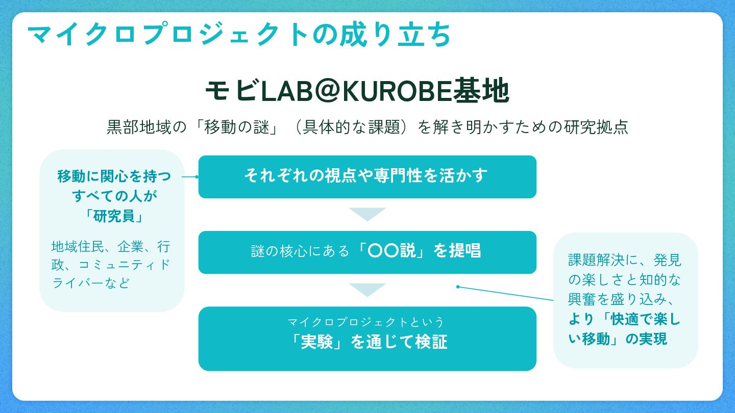 18:00- @MAJIPA 【計画&実験フェーズ: PLAN & DO & DATA】 ・マイクロプロジェクトの実験計画を立てる! ・計画に沿って実験をスタート! ・【特別リサーチ】 9/20(土)・21(日)「くろべフェア」で、市民の皆さんの声を広く集め よう! ・現場でアンケートやヒアリングなどの「研究データ」を集める! 10月 10/4 (土) 10:00- @MAJIPA 【中間報告フェーズ: CHECK】 ・集まったデータを整理・分析。 ・MPJ検証の全体計画発表 ゴール設定 ・ここまでの成果と課題を発表できるようにまとめる! 11月 12月 11/18 (火) 18:00- @MAJIPA 12/19 (金) 18:00- @MAJIPA 【検証フェーズ: ACTION & REPORT】 ・実証実験の実施 ・実験の最終結果をまとめる。 ・私たちの「〇〇説」は正しかったか、結論を出す! 1月 1/24 (土) 10:00- @コラーレマルチホール 【総括&未来へ: NEXT STEP】 ・1年間の研究成果を報告書として集約。 ・次の「移動ミステリー」や本格的なプロジェクト化を考える!