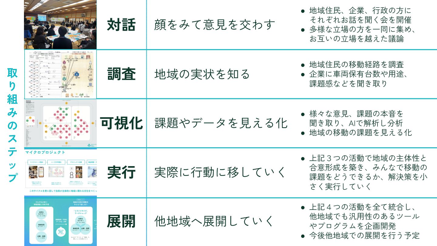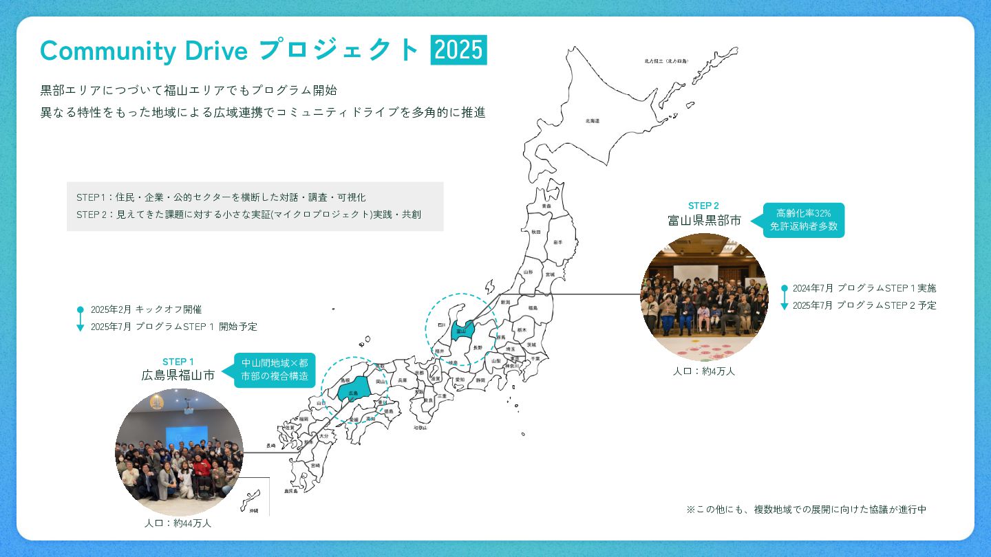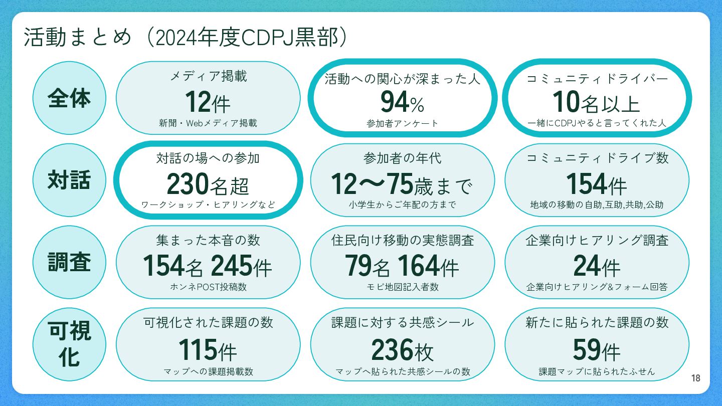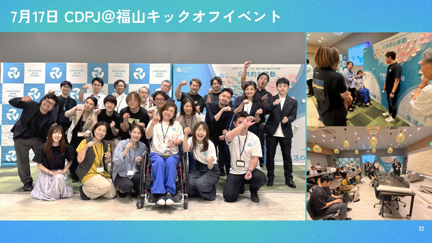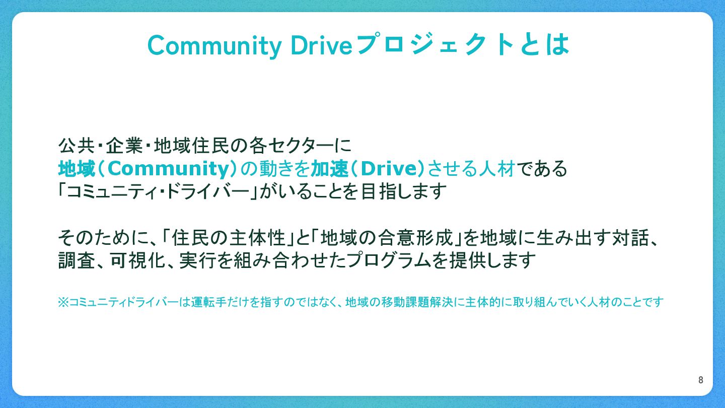 CDPJは、地域の移動課題解決を目的とし、「自分たちの移動を自分たちで考えていく」マインドを持つ「コミュニティ・ドライバー」の発掘・育成を目指す地域共創事業です。
