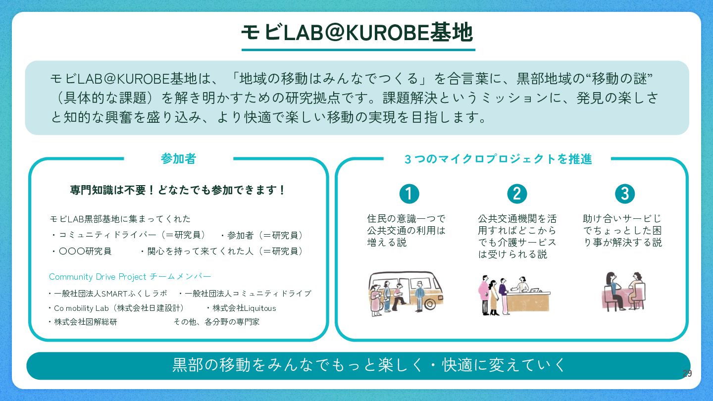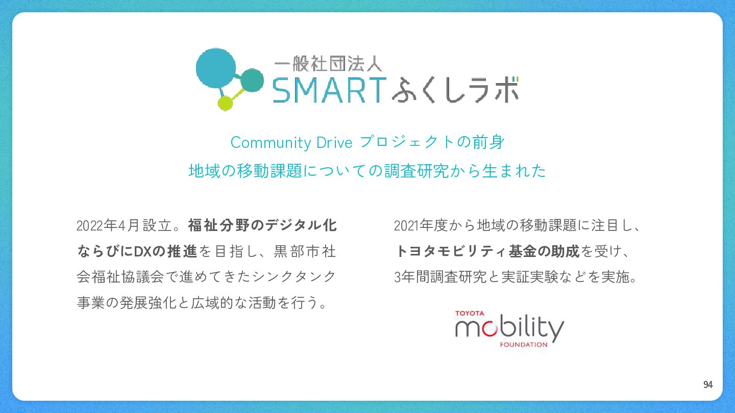 Community Drive プロジェクトの前身 地域の移動課題についての調査研究から生まれた 94 2022年4月設立。福祉分野のデジタル化 ならびにDXの推進を目指し、黒部市社 会福祉協議会で進めてきたシンクタンク 事業の発展強化と広域的な活動を行う。 2021年度から地域の移動課題に注目し、