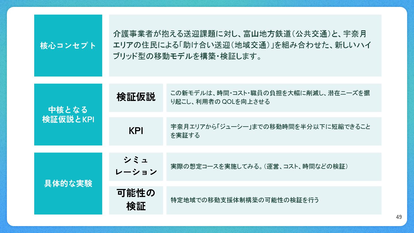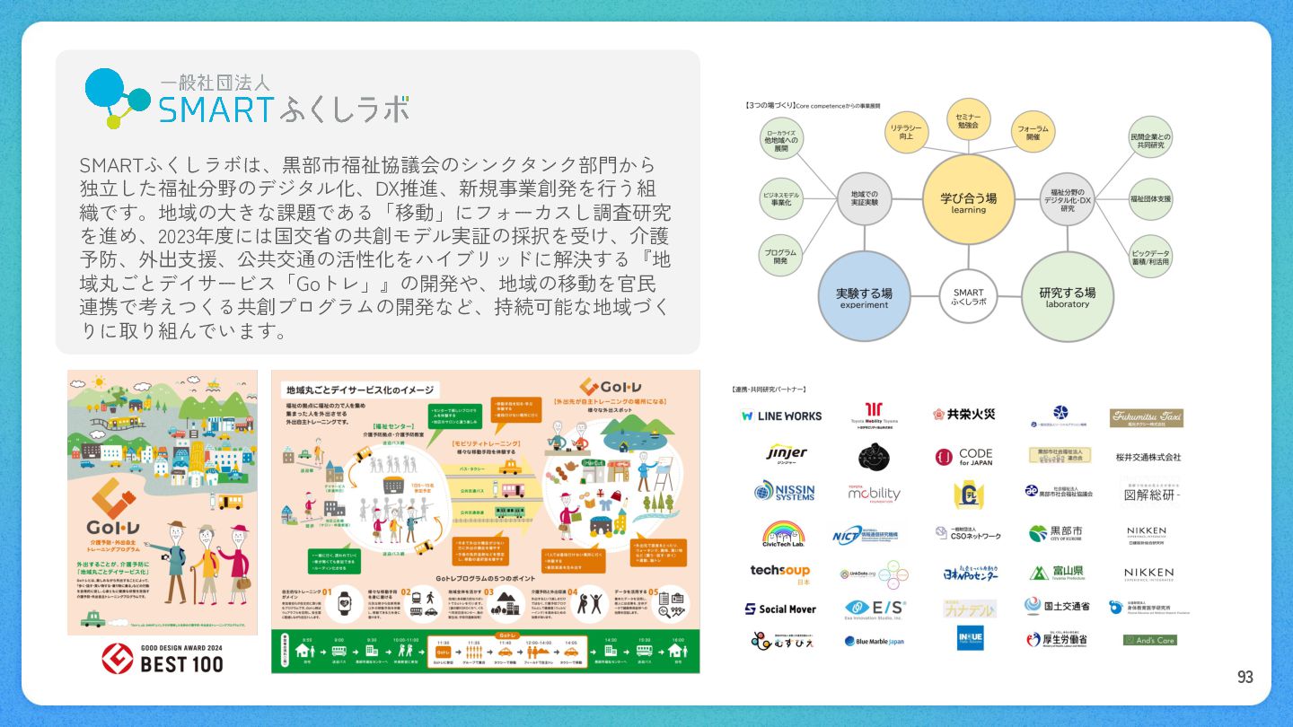 93 SMARTふくしラボは、黒部市福祉協議会のシンクタンク部門から 独立した福祉分野のデジタル化、DX推進、新規事業創発を行う組 織です。地域の大きな課題である「移動」にフォーカスし調査研究 を進め、2023年度には国交省の共創モデル実証の採択を受け、介護 予防、外出支援、公共交通の活性化をハイブリッドに解決する『地 域丸ごとデイサービス「Goトレ」』の開発や、地域の移動を官民 連携で考えつくる共創プログラムの開発など、持続可能な地域づく りに取り組んでいます。