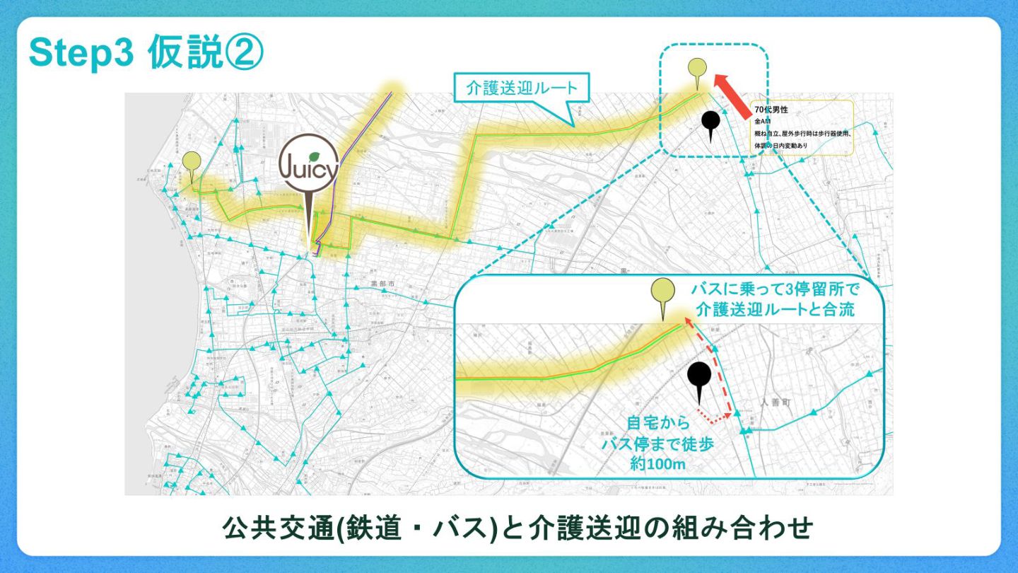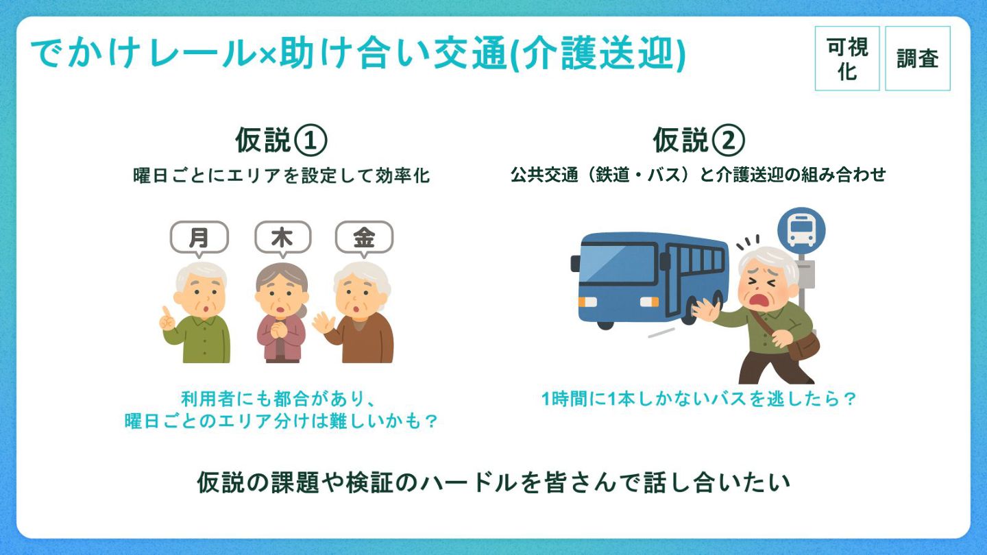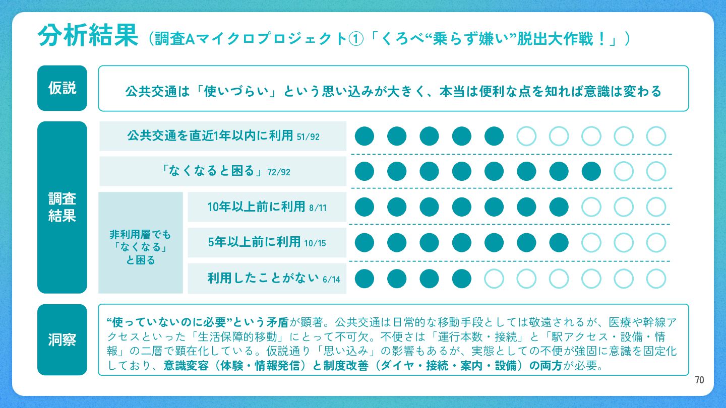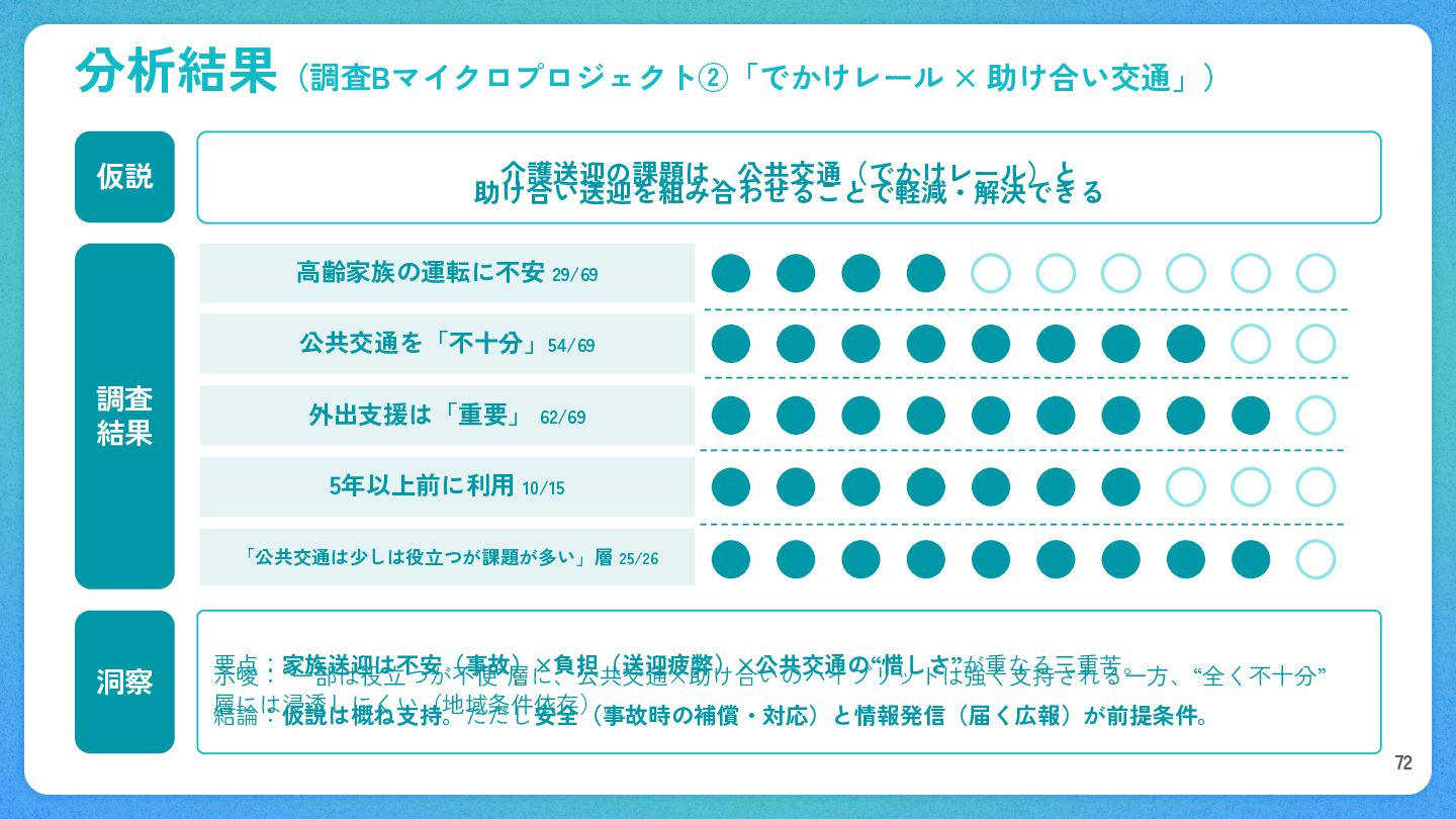 調査 結果 高齢家族の運転に不安 29/69 公共交通を「不十分」54/69 外出支援は「重要」 62/69 5年以上前に利用 10/15 「公共交通は少しは役立つが課題が多い」層 25/26 仮説 洞察