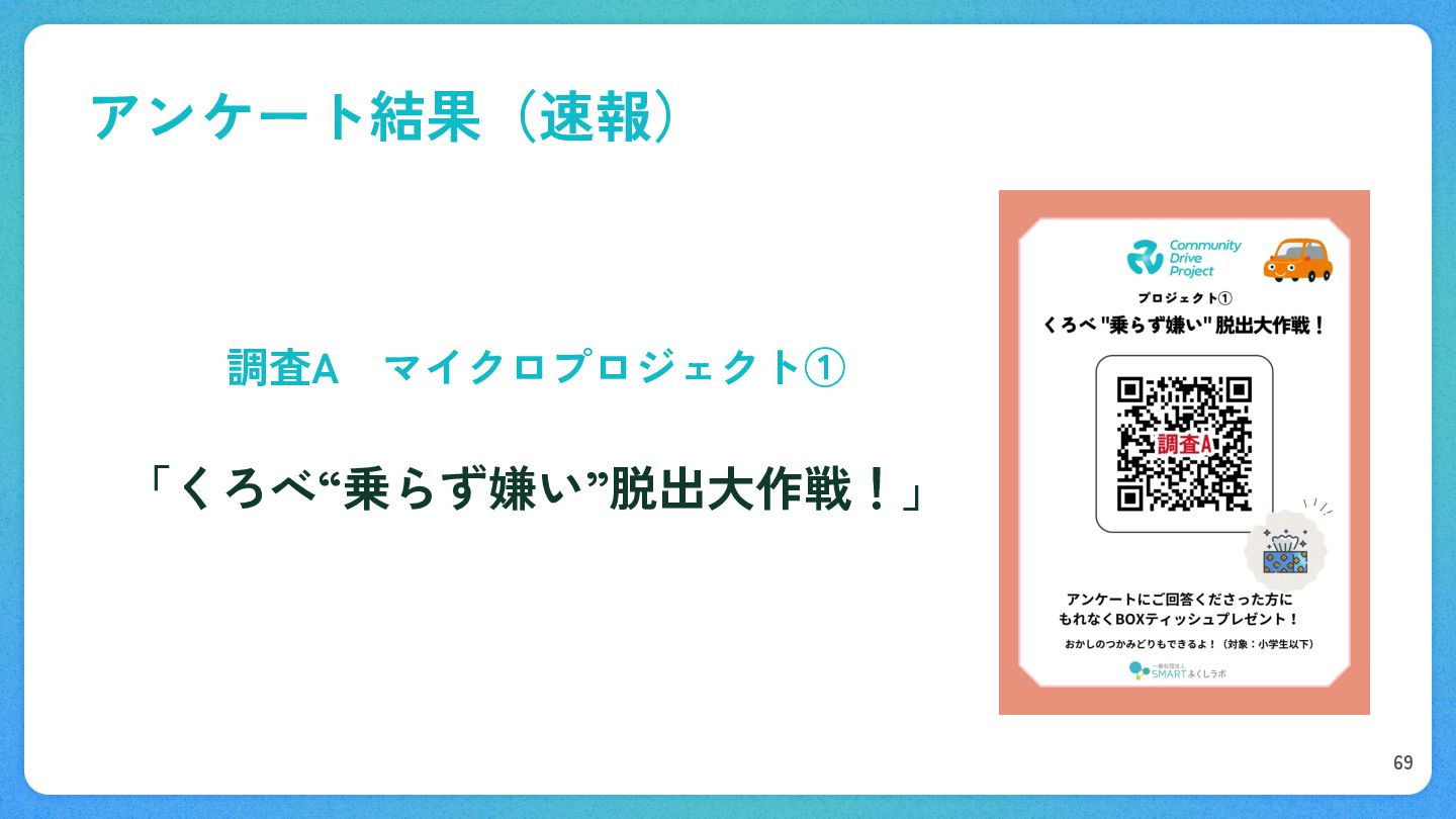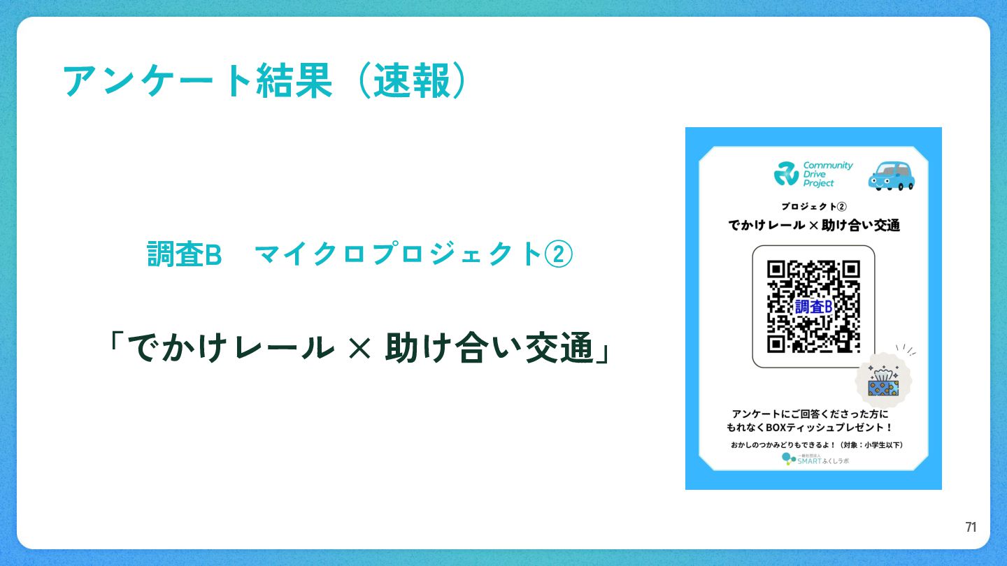 アンケート結果(速報) 調査B マイクロプロジェクト② 「でかけレール × 助け合い交通」 71