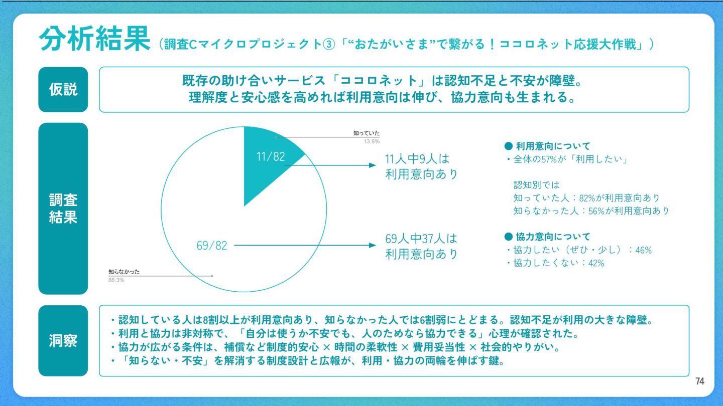 費用妥当性 × 社会的やりがい。 ・「知らない・不安」を解消する制度設計と広報が、利用・協力の両輪を伸ばす鍵。 調査 結果 仮説 洞察 11人中9人は 利用意向あり 69人中37人は 利用意向あり 11/82 69/82 • 利用意向について ・全体の57%が「利用したい」 認知別では 知っていた人:82%が利用意向あり 知らなかった人:56%が利用意向あり • 協力意向について ・協力したい(ぜひ・少し):46% ・協力したくない:42%