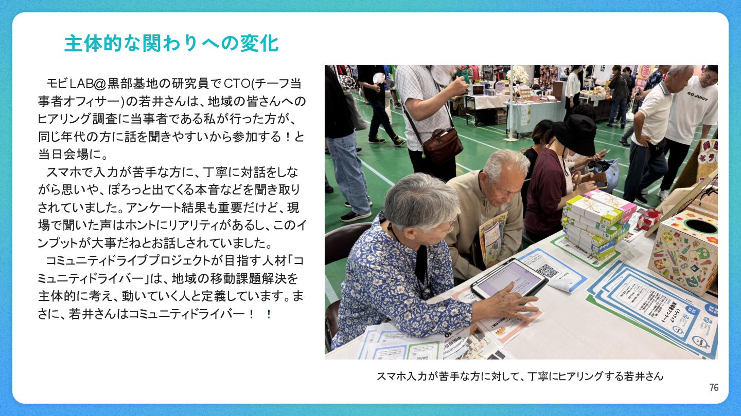 ンプットが大事だねとお話しされていました。 コミュニティドライブプロジェクトが目指す人材「コ ミュニティドライバー」は、地域の移動課題解決を 主体的に考え、動いていく人と定義しています。ま さに、若井さんはコミュニティドライバー! ! 76 主体的な関わりへの変化 スマホ入力が苦手な方に対して、丁寧にヒアリングする若井さん