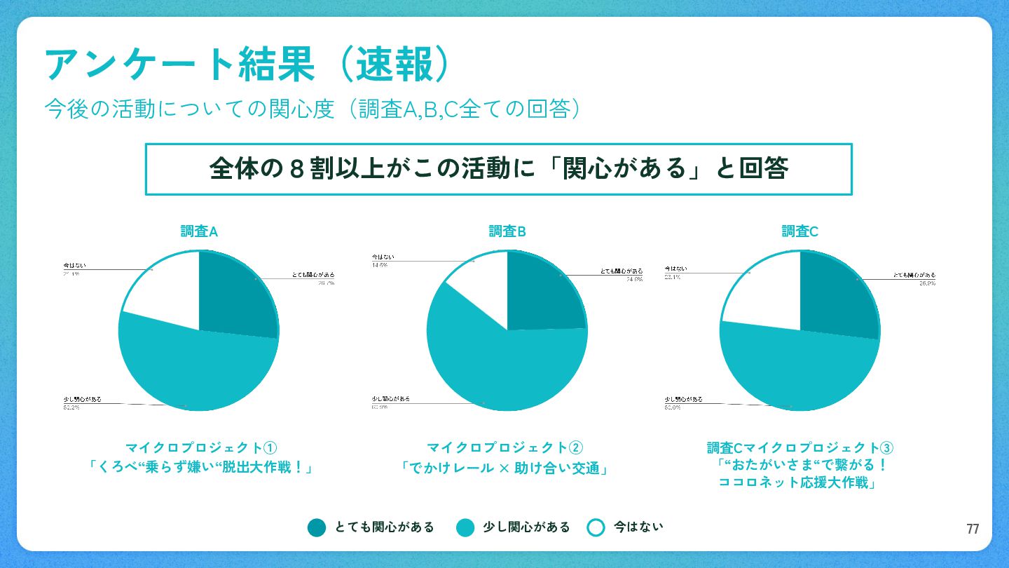 今後の活動についての関心度(調査A,B,C全ての回答) アンケート結果(速報) 77 マイクロプロジェクト① 「くろべ“乗らず嫌い“脱出大作戦!」 マイクロプロジェクト② 「でかけレール × 助け合い交通」 調査Cマイクロプロジェクト③