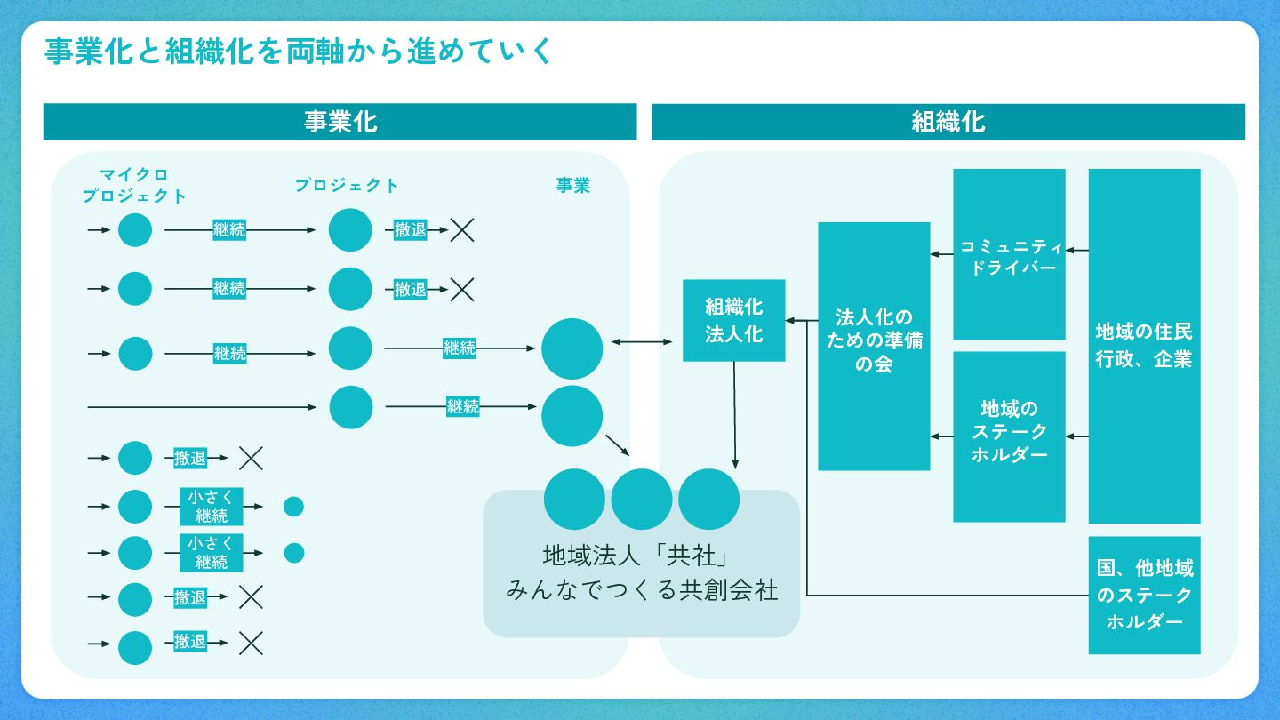 事業化と組織化を両軸から進めていく マイクロ プロジェクト プロジェクト 事業 撤退 撤退 事業化 組織化 法人化